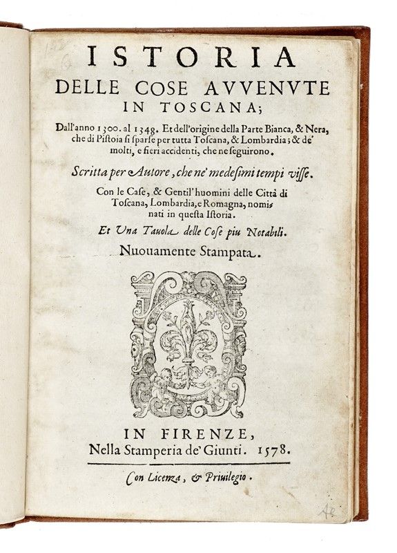 In-4° (mm 205x140). Pagine [24], 217, [3]. Marca tipografica al frontespizio e in fine; testatine e capilettera istoriati in legno. Esemplare rifilato, con un rinforzo di nastro adesivo al margine interno del primo fascicolo e un'ampia gora a tutto il volume. Legatura moderna in piena pelle con titoli e fregi al dorso a 5 nervi; tagli spruzzati di rosso e sguardie rinnovate. SI AGGIUNGE: Dati Goro, Istoria di Firenze [...] dall'anno MCCCLXXX all'anno MCCCCV. In Firenze: nella stamperia di Giuseppe Manni, 1735.