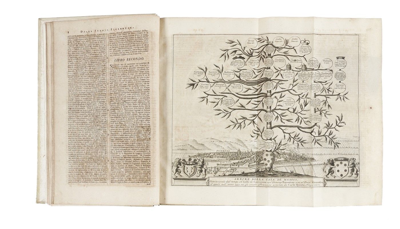 In-folio (mm 388x250). Con 7 tavole fuori testo nelle quali sono ritratti, tra gli altri, l'Autore, Cosimo II de' Medici e Carlo V e 1 ripiegata contenente l'albero genealogico della Casa Medici. Frontespizio in rosso e nero, con vignetta calcografica, testatine calcografiche, capilettera xilografici. Bruniture diffuse e gore marginali. Legatura coeva in piena pergamena, con titoli in oro su tassello al dorso a 6 nervi e tagli spruzzati di rosso. Fori di tarlo al dorso e tracce d'uso alle cerniere; sguardie rinnovate. Ex-libris al contropiatto anteriore.