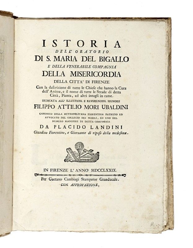 In-4° (mm 270x195). Con, nel complesso, 52 tavole calcografiche, di cui 4 a colori raffiguranti gli stemmi dei vari Quartieri di Firenze e 5 carte più volte ripiegate (1 raffigurante la pianta della città). Più corti i margini di alcune tavole, con bruniture ad alcune tavole, altrimenti esemplare ben conservato e impresso su carta forte. Legatura in cartonato, con titoli manoscritti al dorso e sguardie rinnovate. Bruniture da esposizione al dorso e tracce d'uso. Ex-libris al contropiatto anteriore. Collazione del testo disponibile su richiesta.