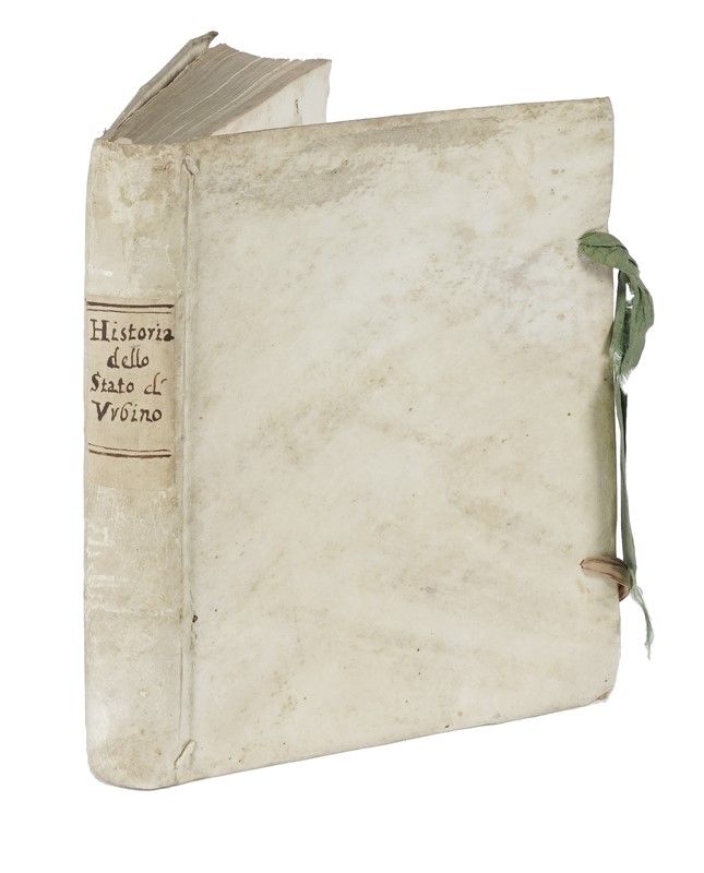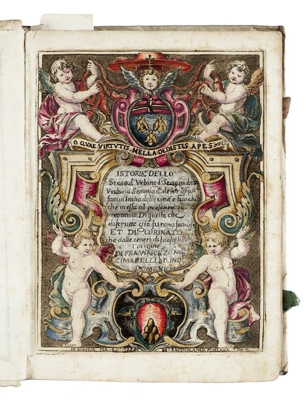 In-4° (mm 210x152). Pagine 16, [24], 184, 184. Il volume si apre con una carta extra che reca un grande stemma episcopale miniato in oro, argento e colori. Frontespizio calcografico con il titolo all'interno di uno scudo circondato da putti, e con gli stemmi del cardinale Francesco Barberini (1597-1679), dedicatario dell'opera, in alto, e del comune di Corinaldo, in basso, finemente colorato a mano all'epoca, con dettagli in argento e oro. Numerosi grandi capilettera xilografici, testo in corsivo. Pergamena flessibile coeva con lacci in seta, tassello cartaceo al dorso. Micro strappi (visibili solo in controluce) causati dall'acido dell'inchiostro alla parte del frontespizio con il titolo su fondo argento, arrossature alle prime e ultime carte, fioriture occasionali per lo più ai margini, per il resto buona copia genuina.