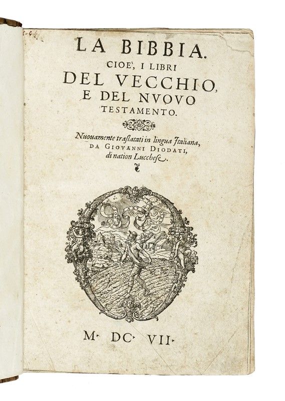 2 parti in 1 volume in-4° (mm 246x174). Pagine [4], 847 (Vecchio Testamento); 314 (Nuovo Testamento). Assenti le 178 pp. dei Libri apocrifi. Grande marca tipografica xilografica al frontespizio, testo su due colonne, testatine, capilettera e finalini xilografici. Frontespizio con piccola mancanza all'angolo superiore esterno e un po' gualcito, strappo parzialmente restaurato alle pp. 11-12, minimo lavoro di tarlo al margine inferiore (pp. 735 e seguenti), carte uniformemente ingiallite, e altre trascurabili tracce del tempo. Mezza pelle settecentesca, dorso a nervi e con tassello con titolo dorato (un po' sciupato), tagli azzurri.