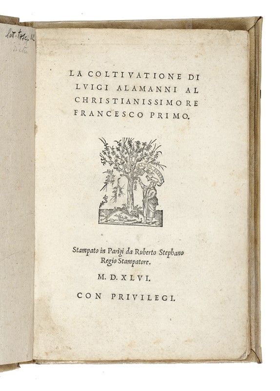 In-4° (mm 203x135). Carte 154, [4]. Presenti le due carte con la Lettera a Madama Dalphina e le due con il Privilegio di Francesco I, rilegate in fine. Marca xilografica al frontespizio. Uno strappo restaurato alla carta 137, altrimenti buona copia, con pallide fioriture. Legatura successiva in piena pergamena, con titoli in oro al dorso e legacci; sguardie in carta decorata ed ex-libris al contropiatto anteriore.