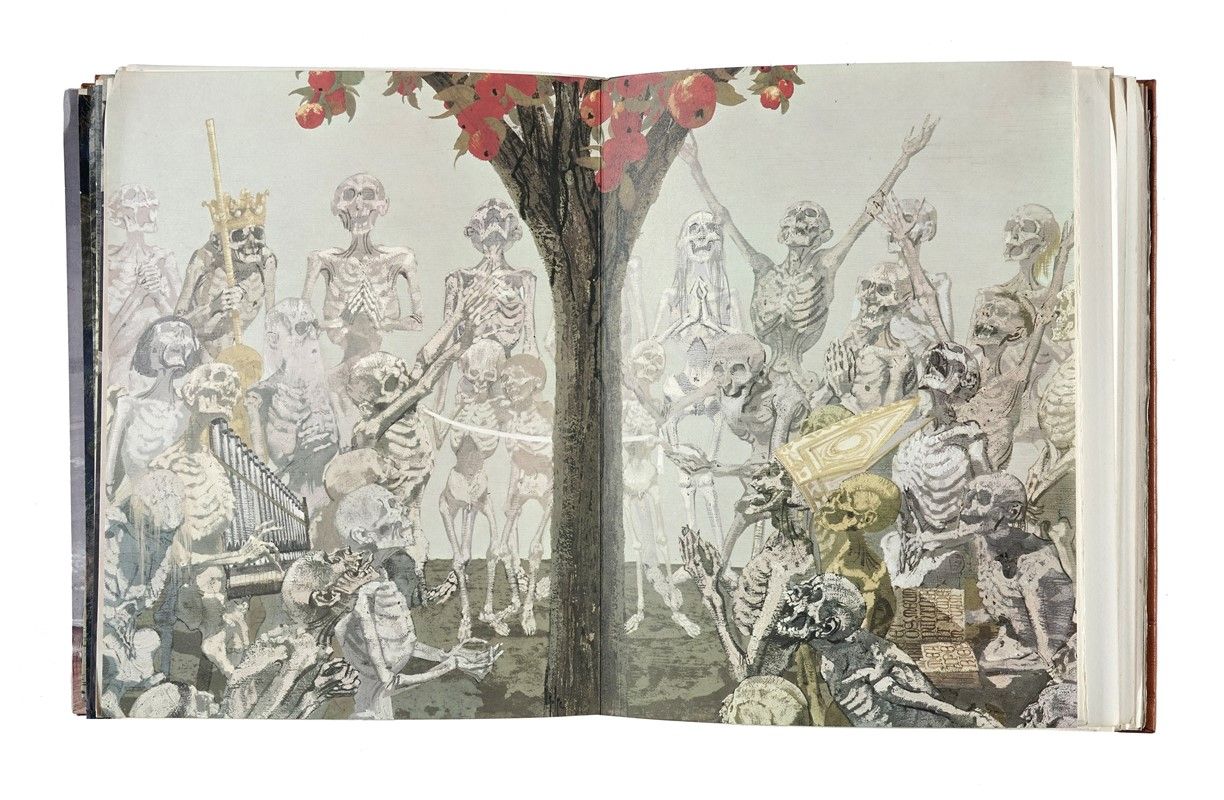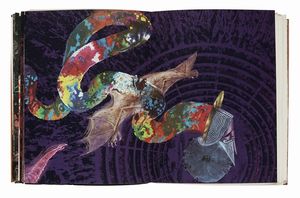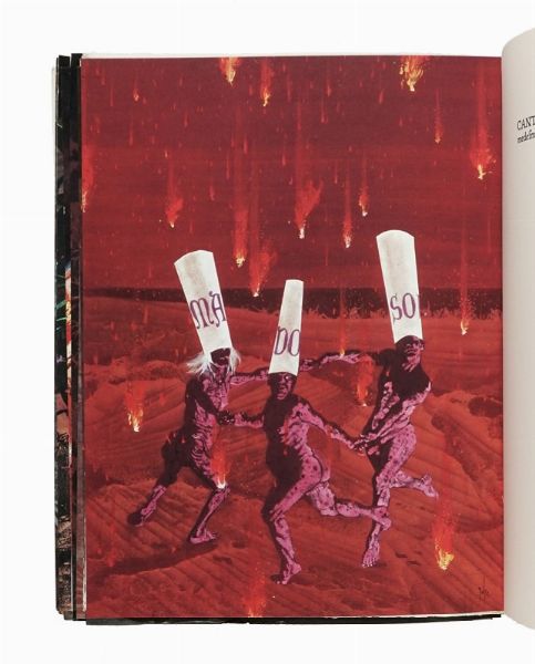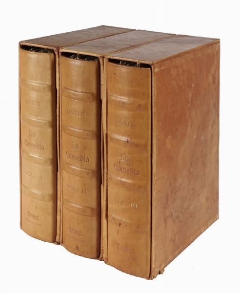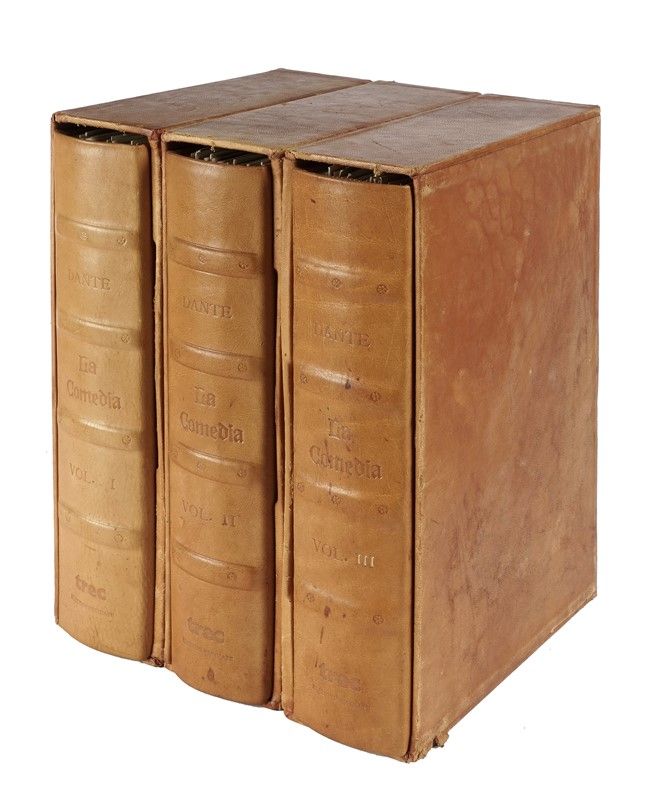 3 volumi in-4° (mm 320x225). Ottimo esemplare in barbe con, complessivamente, 100 tavole a colori di Wolfgango Peretti Poggi, una per ogni canto, sciolte e fuori testo, molte delle quali a doppia pagina e tripla pagina. Legatura in piena pelle con titoli al dorso a 4 nervi e medaglione in bronzo sbalzato col volto di Dante, Virgilio e Beatrice al piatto anteriore rispettivamente del primo, secondo e terzo volume; sguardie in seta. Lieve scoloritura da esposizione al dorso. Entro cofanetti editoriali in piena pelle, lievemente spellati e con la cerniera del taglio superiore di quello del terzo volume rotta. Uno dei 1000 esemplari di lusso, su una tiratura complessiva di 1100 copie, firmato dall'Artista al colophon del terzo volume.