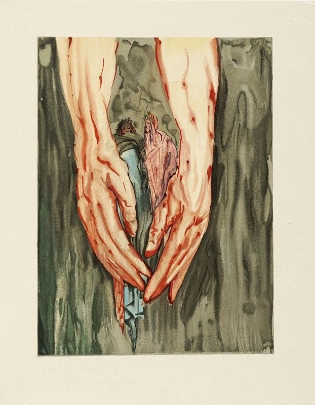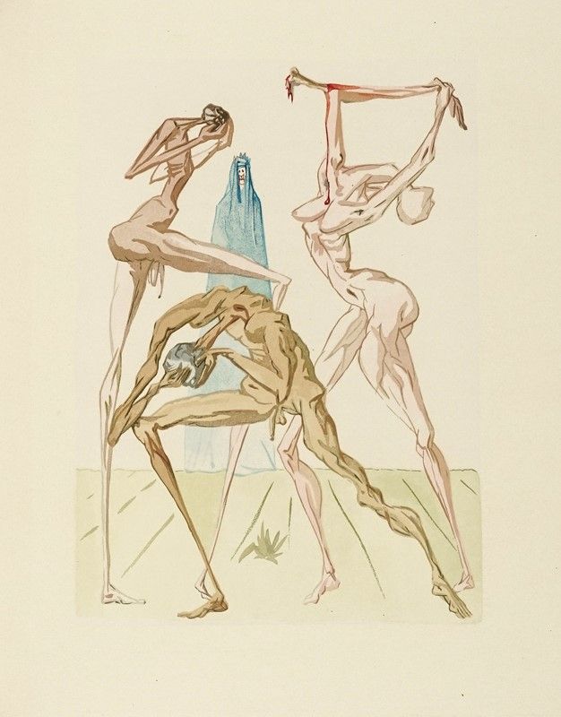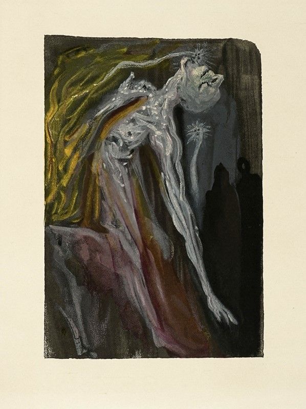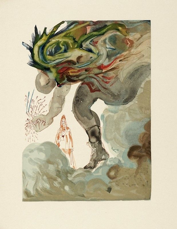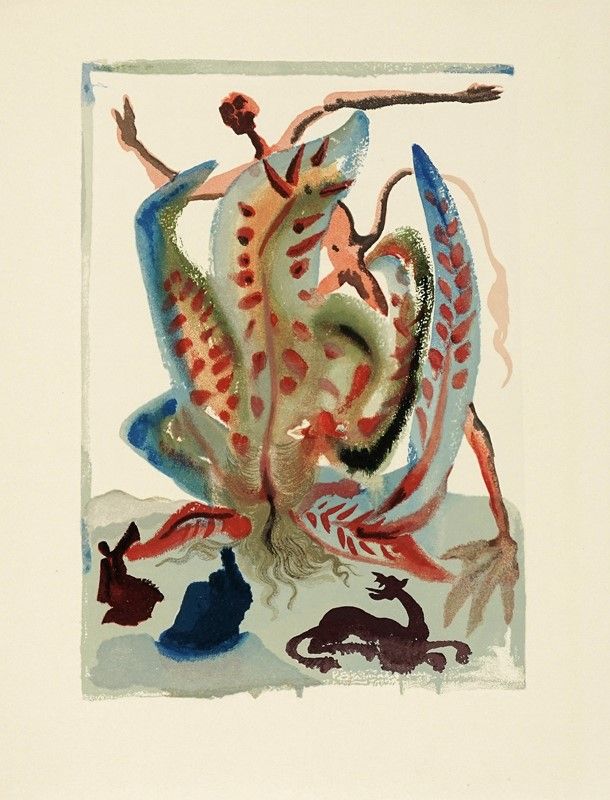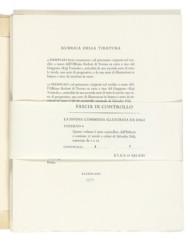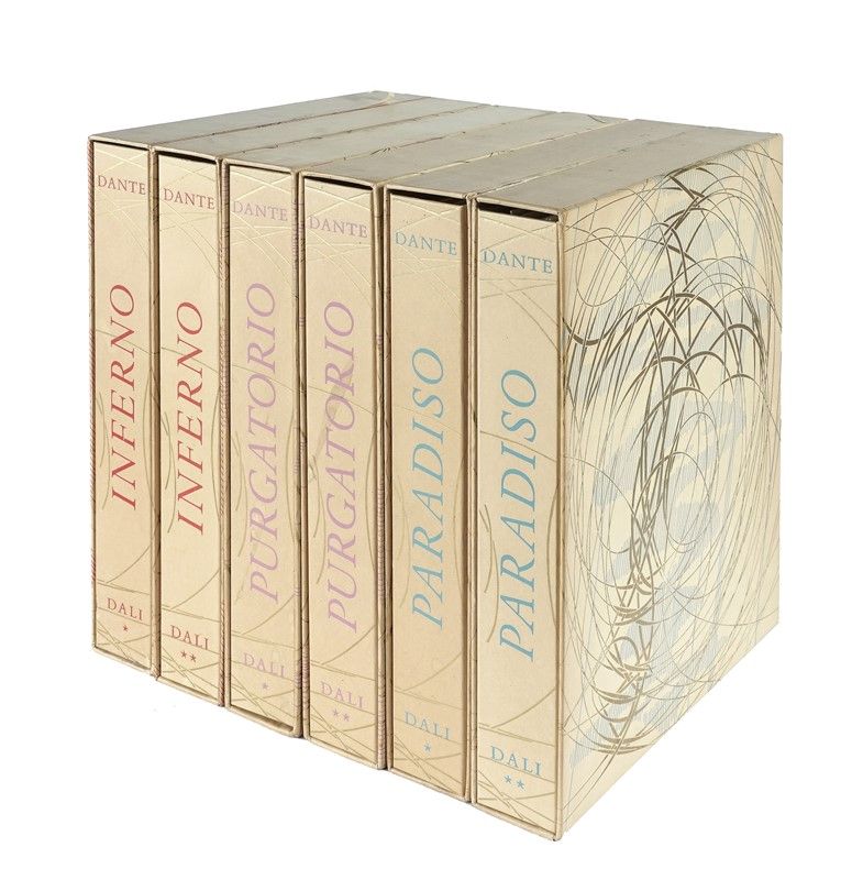 6 volumi in-folio (mm 332x253). Con, complessivamente, 100 splendide tavole a colori di Salvador Dalì, numerate al verso, sciolte e fuori testo. Lievi bruniture uniformi ad alcune tavole, altrimenti buona copia in barbe a fascicoli sciolti, stampata in nero; testo a due colori, rosso per i due tomi dell'Inferno, viola per il Purgatorio e blu per il Paradiso. Ottime condizioni. Ciascun volume entro brossura con titolo in rosso al piatto anteriore e velina protettiva, cartella e custodia in cartonato editoriali a motivi geometrici colorati, con macchioline sparse e spellature ai tagli della custodia del primo volume dell'Inferno, del secondo del Purgatorio e del primo del Paradiso. Conservate tutte e 6 le fascette di controllo e la rubrica delle tirature. Uno dei 2900 esemplari impressi dalla Stamperia Valdonega su carta a mano dei Fratelli Magnani di Pescia, su una tiratura complessiva di 3044 copie.