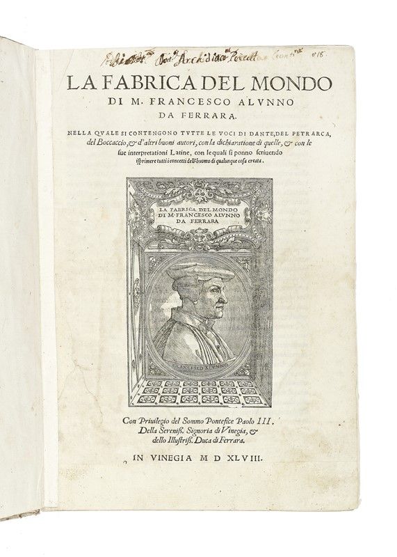 In-folio (mm 290x201). Carte: [6], 259, [49]. Frontespizio con ritratto dell'Autore inciso su legno, testo su due colonne, grande e bella marca tipografica alla fine del testo e in fine. Margine inferiore del frontespizio risarcito, forellino all'ultima carta con minima perdita di testo, ma nel complesso buona copia in cartonato coevo settecentesco con il dorso rivestito in carta decorata (abrasioni e sbucciature). [SI AGGIUNGE:] Altra edizione della stessa opera stampata a Venezia da Francesco Sansovino nel 1560, non collazionata e priva di legatura.