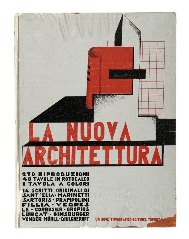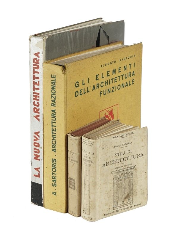 In-4° (mm 320x236). Buona copia, con moltissime illustrazioni, la maggior parte delle quali a piena pagina nel testo, di cui 1 a colori. Legatura editoriale in tela con copertina illustrata da Ugo Pozzo in rosso e nero su sfondo argento, con titoli al piatto. Ampie mancanze, concentrate principalmente al dorso e al piatto posteriore. SI AGGIUNGE: Sartoris Alberto, Gli elementi dell'Architettura funzionale [...]. Prefazione di Le Corbusier... Milano: Hoepli, 1932. SI AGGIUNGE: Pedrini Antonio, La città moderna... Milano: Hoepli, 1905; SI AGGIUNGE: Stili di Architettura. Seconda edizione. Milano: Hoepli, s.d. (volume acefalo). Lotto non possibile di restituzione.