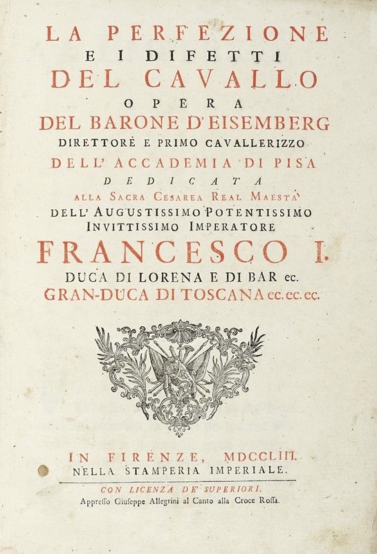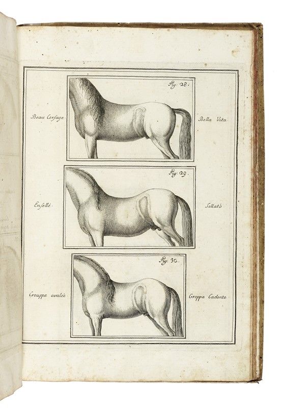 In-folio (mm 360x240). Pagine [4], CXLIII, 1 bianca con 1 antiporta figurata e 23 tavole fuori testo incise in rame. Frontespizio in inchiostro rosso e nero con fregio xilografico. Testo francese con traduzione italiana a fronte. Mancanza all'angolo superiore esterno dell'antiporta, macchiata, alcune macchie e fioriture alle tavole e un lavoro interno alle carte. Legatura coeva in piena pergamena rigida con titolo manoscritto al dorso. Macchie ai piatti. Alla carta di guardia anteriore nota di possesso manoscritta datata 1787.