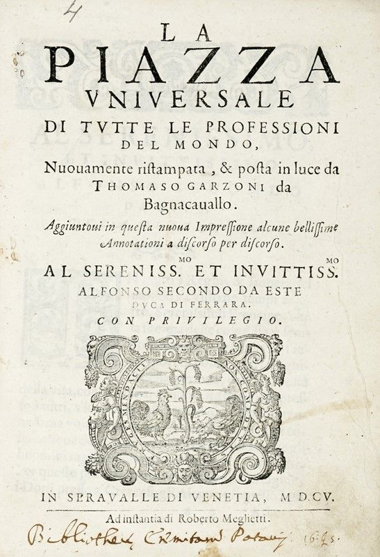 In-4° (mm 205x 152). Pagine: [36], 933, [3]. Testo in corsivo. Pergamena semi-flessibile coeva con titolo anticamente manoscritto al dorso (tracce d’uso e del tempo). Cerniera anteriore aperta, antica firma di appartenenza al frontespizio, che ha trascurabili forellini al margine interno (come anche l’ultima carta bianca), foro con piccola perdita alle pp. 33-36, trascurabile lavorino di tarlo al margine interno di un paio di fascicoli, strappo con minima perdita all’angolo inferiore della p. 373-374, altro lavoretto di tarlo al margine inferiore dei fascicoli 2K-2Q (tocca qualche lettera ai fascicoli P e Q), e altre trascurabili tracce del tempo.