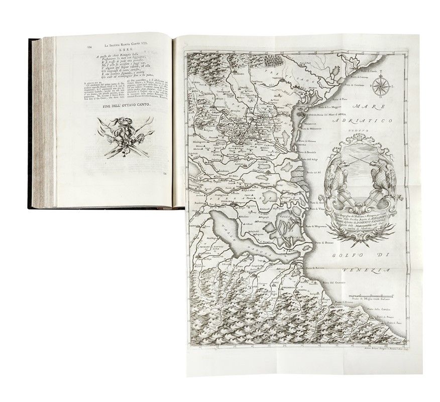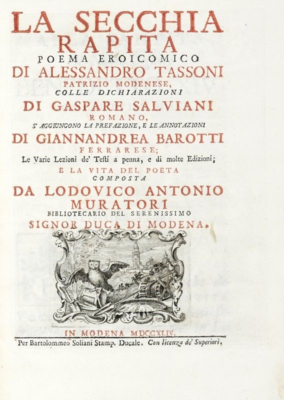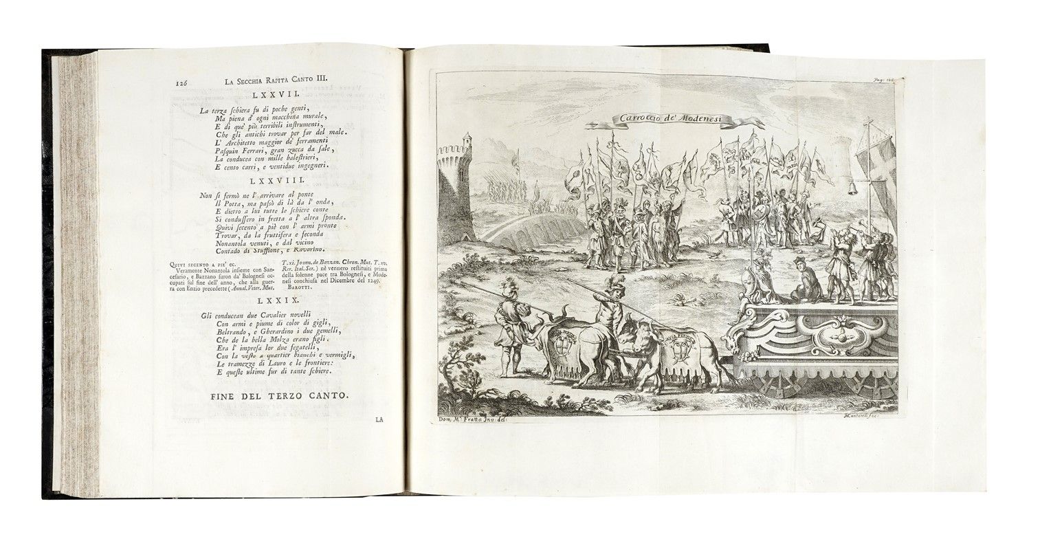 In-4° (mm 273x205). Pagine LX, 92, 489, [1] + 1 antiporta allegorica, 1 ritratto dell'Autore, 12 figure numerate I-XII, 2 grandi mappe più volte ripiegate, 1 carta più volte ripiegata con il Carroccio de' Modenesi, 1 carta ripiegata con la riproduzione della grafia del Tassoni, il tutto inciso in rame fuori testo + 1 carta di albero genealogico ripiegata e 1 carta con la Torre di Modena rilegata in fine, entrambe xilografiche. Vignetta calcografica al frontespizio in inchiostro rosso e nero, capilettera incisi sia in legno che in rame, numerose vignette calcografiche nel testo a mo' di testatine e finalini. Ottima copia, con lievissime fioriture e le carte K4-K5 staccate, ma presenti e ben conservate. Legatura successiva in mezza pelle con punte e piatti decorati, titoli e fregi dorati al dorso a 4 nervi; sguardie marmorizzate e tagli spruzzati. Tracce d'uso. Ex-libris applicato al contropiatto anteriore.