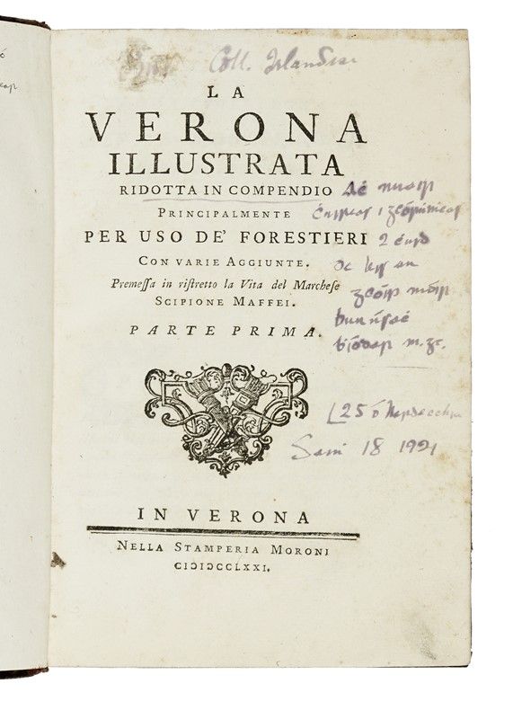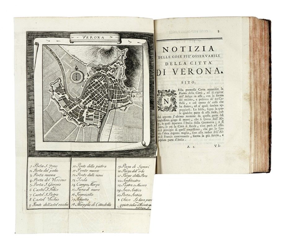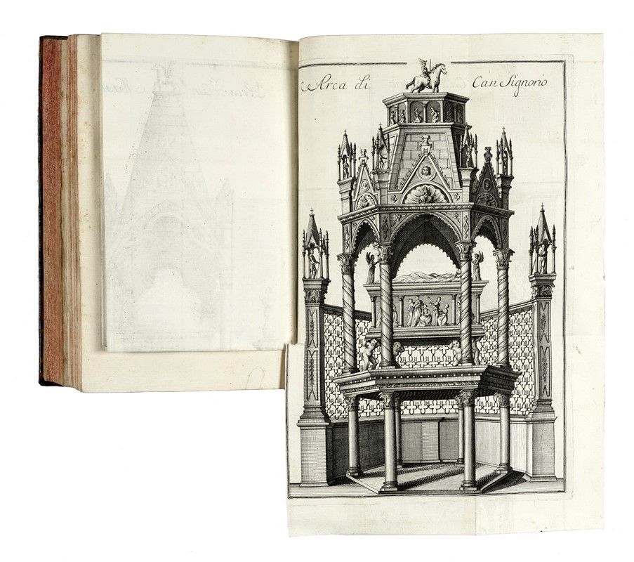 In-8° (mm 203x134) in 2 parti. Pagine: LI, [5], 176, con [6 (di 7 - assente come d'uso il ritratto)] tavole calcografiche ripiegate; 173, [7], con [17] tavole calcografiche ripiegate, alcune sottoscritte "Dall'Acqua f.". Frontespizio con dedica novecentesca, per il resto copia molto buona con le tavole in freschissima impressione (qualche strappo alle attaccature) in vitellino spugnato coevo con dorso riccamente decorato in oro (mancanze e sbucciature), tagli spruzzati di rosso.