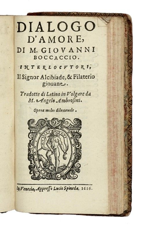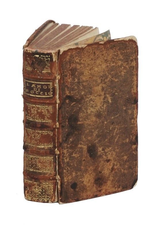 In-12° (mm 130x70). Marca il legno al frontespizio, testine e capilettera xilografici nel testo. Legatura in piena pelle con fregi e titoli in oro si tassello al dorso a 5 nervi, tagli rossi e sguardie marmorizzate. Difetti alle cerniere, mancanze alle cuffie e ai piatti. LEGATO CON: Id., Laberinto d'amore... In Venetia: appresso Lucio Spineda, 1616. LEGATO CON: Id., Dialogo d'amore... In Venetia: appresso Lucio Spineda, 1616.