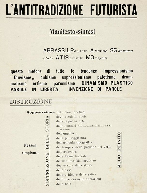 In-4° (mm 290x231). Carte [2]. Segni centrali di precedenti piegature, con fioriture e macchioline concentrate principalmente al verso dell'ultima carta. Esemplare con difetti. SI AGGIUNGE: Papini Giovanni, Contro Roma e contro Benedetto Croce. Discorso di Giovanni Papini detto al Meeting futurista del Teatro Costanzi il 21 febbraio 1913. Milano: Direzione del Movimento Futurista, s.d. [i.e. febbraio 1913]. In-4° (mm 290x231). Carte [2]. Segni centrali di precedenti piegature, con fioriture, macchioline e strappetti marginali. SI AGGIUNGE: Joly Auguste, Le Futurisme et la Philosophie - Il Futurismo e la Filosofia (Dalla rivista «La Belgique artistique et littéraire», Luglio 1912). Milano: Direction du Mouvement Futuriste, s.d. [i.e. luglio 1912]. In-4° (mm 293x231). Carte [2]. Segno centrale di precedente piegatura, lievi e diffuse fioriture e una piega marginale alla prima carta.