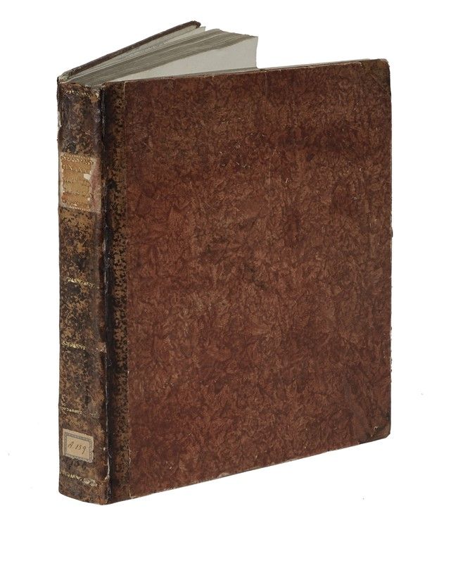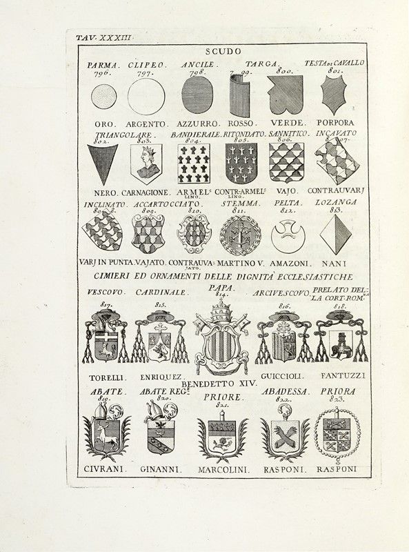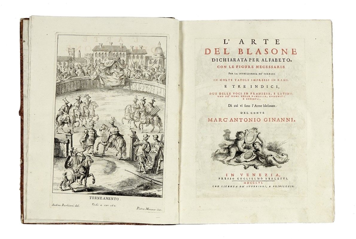 In-folio (mm 318x240). Pagine 392. Antiporta incisa in rame, frontespizio in rosso e nero con vignetta calcografica, 35 tavole numerate I-XXXV incise in rame a piena pagina nel testo contenenti oltre 880 figure di scudi e blasoni; 38 fra testatine e grandi finalini calcografici. Minime tracce del tempo. Mezza pelle coeva con tassello e decorazioni dorate al dorso, piatti marmorizzati (sbucciature alle estremità).