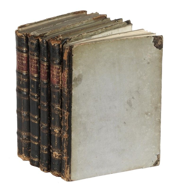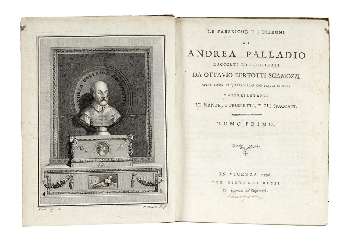 [CON:] Palladio, Andrea. Le terme dei Romani disegnate da Andrea Palladio e ripubblicate con la giunta di alcune osservazioni... In Vicenza: per Giovanni Rossi, 1797. 5 volumi in 4° (mm 228 x 171 ca.) Pagine viii 128 + antiporta calcografica con busto di Palladio, una tavola nel testo e 52 rilegate in fine; iv 76 + 51 tavole in fine; iv 60 + 52 tavole (su 50 carte) in fine; iv 80 + 54 tavole in fine. Terme: pagine 55 [1] + frontespizio calcografico e 25 tavole in fine. Con, nel complesso 237 tavole fuori testo incise in rame, di cui molte ripiegate. Legatura uniforme coeva in mezza pelle e angoli con tasselli in marocchino rosso e decorazioni dorate ai dorsi (sciupata, con sbucciature e piccole mancanze, piatti rivestiti in carta grigia muta con sbucciature agli angoli e alle estremità). Pallidissima e trascurabile ombra sottile ai margini superiori, piccolo strappo con minima perdita marginale all'ultima tav. del tomo III, insignificanti forellini marginali e pallida macchietta alle ultime tre tavv. delle Terme, e altre trascurabili tracce del tempo. Genuino insieme con le tavole in fresca impressione.