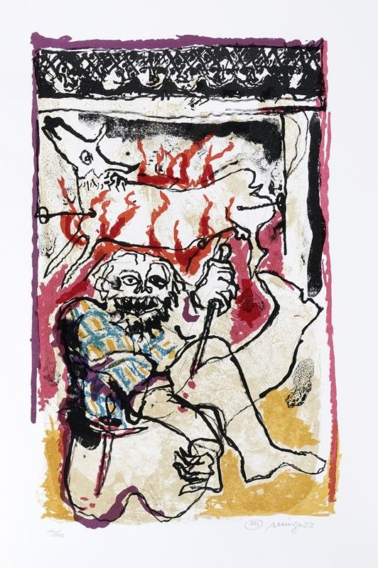 In-folio (mm 500x350). Pagine [2] bianche, 135, [12], [3] bianche. Con 9 splendide litografie originali a colori fuori testo di Renato Guttuso, Franz Borghese, Giovanni Cappelli, Felicita Frai, Luciano Minguzzi, Domenico Purificato, Aligi Sussu e Orfeo Tamburi, racchiuse entro doppia velina protettiva, numerate in basso a sinistra e firmate a matita in basso a destra dagli Artisti. Esemplare marginoso, perfettamente conservato nelle sue barbe. Copia n. 14 di una tiratura complessiva di 159 esemplari, uno dei 125 numerati all'araba da 1 a 125. Legatura in piena pelle maculata di Giovanni de Stefanis, con titoli impressi in oro al dorso a 4 nervi e bella piastra a smalti colorati di Domenico Purificato entro doppia cornice di filetti concentrici al piatto anteriore. Opera conservata in custodia in tela marrone. Ottime condizioni.