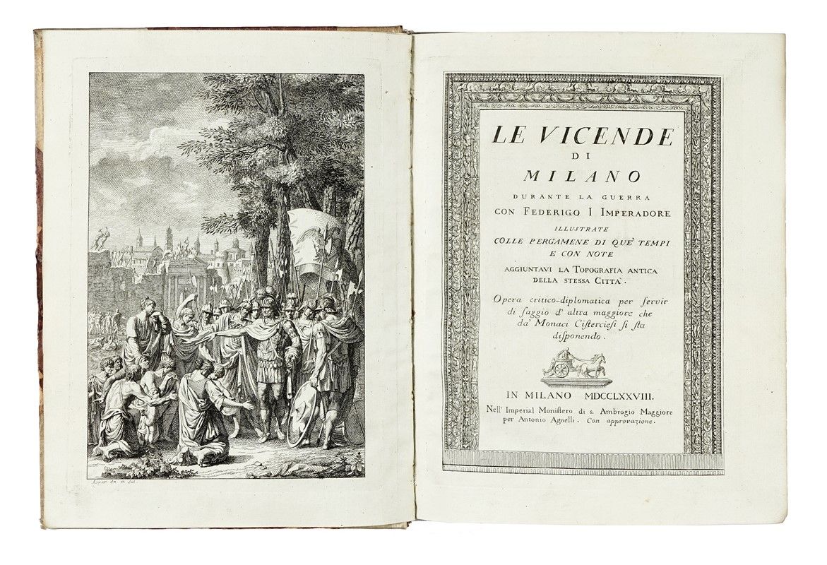 In-4 (mm 248x188). Pagine: [6], XL, 300. Frontespizio e antiporta incisi di Domenico Aspari, testine e iniziali calcografiche, e 2 tavole calcografiche ripiegate, di cui una è l’ampia e bella veduta milanese a vol d’uccello intitolata “Topografia della città di Milano assediata dall’Imperadore Federigo I nell’anno 1558”. Interamente stampato su carta azzurrina (un po’ sbiadita), piccolo restauro all’attacco della prima tavola ripiegata e al margine interno delle pagine 136-139, ma nel complesso buona copia completa e fresca in mezza pergamena posteriore con tassello in marocchino rosso al dorso.