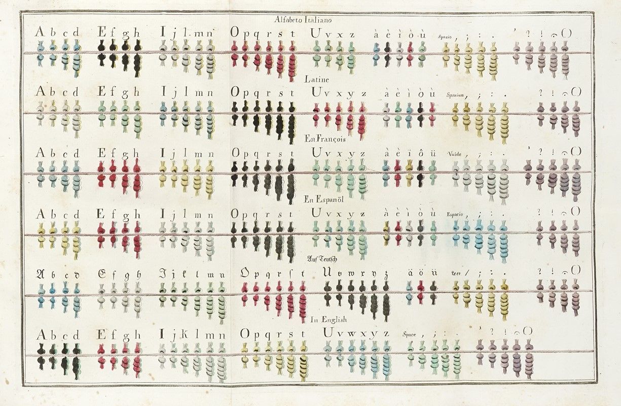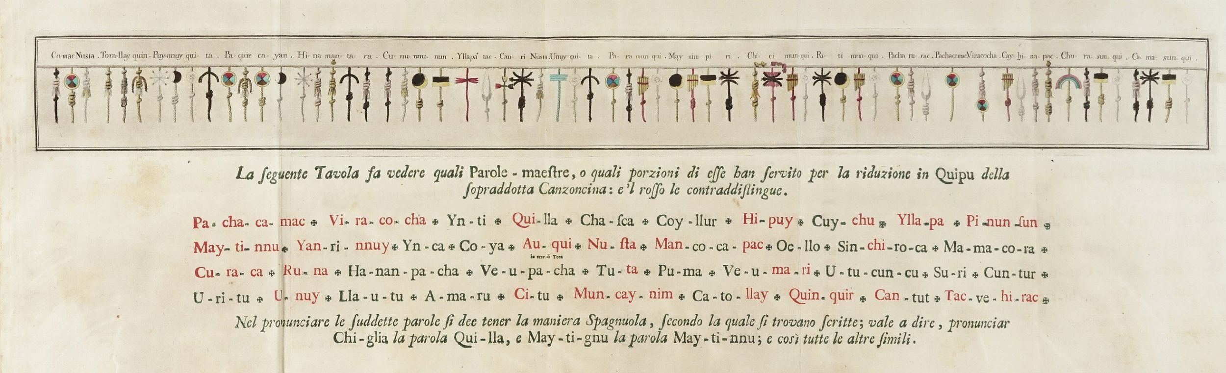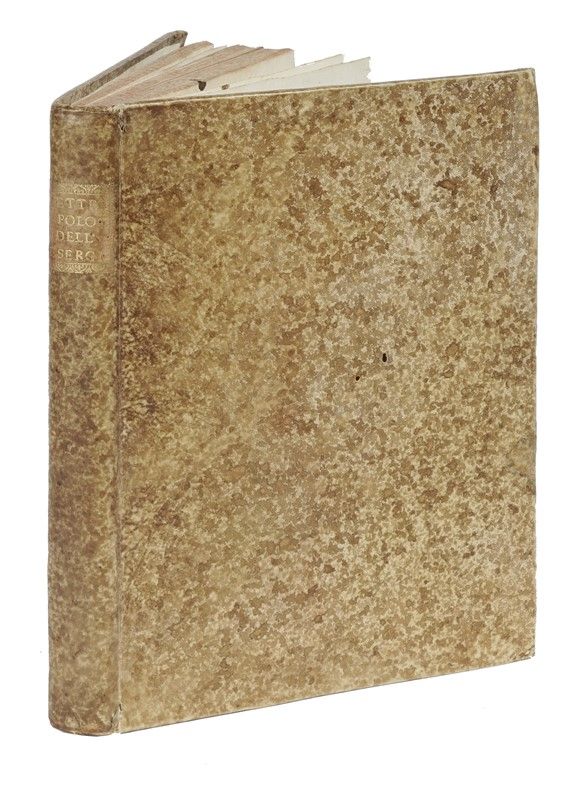 In-folio (mm 270x193). Pagine: [14], 320 [i.e. 326, il fascicolo P ha 3 carte in più], [16]. Frontespizio stampato a quattro colori con una vignetta in rosso con motto dell'Accademia della Crusca, 3 tavole calcografiche ripiegate finemente colorate a mano (una con testo stampato in rosso e in verde), una testatina e 2 capilettera calcografici, una piccola xilografia con l'Albero della Vita a p. 172, e un'altra piccola xilografia con nodo quipu a p. 193. Pallide fioriture occasionali, una tavola e qualche carta lievemente arrossate, qualche macchiolina, ma nel complesso ottima copia in pergamena coeva maculata e con tassello al dorso, tagli spruzzati di rosso, segnacolo in seta verde (minimi difetti).