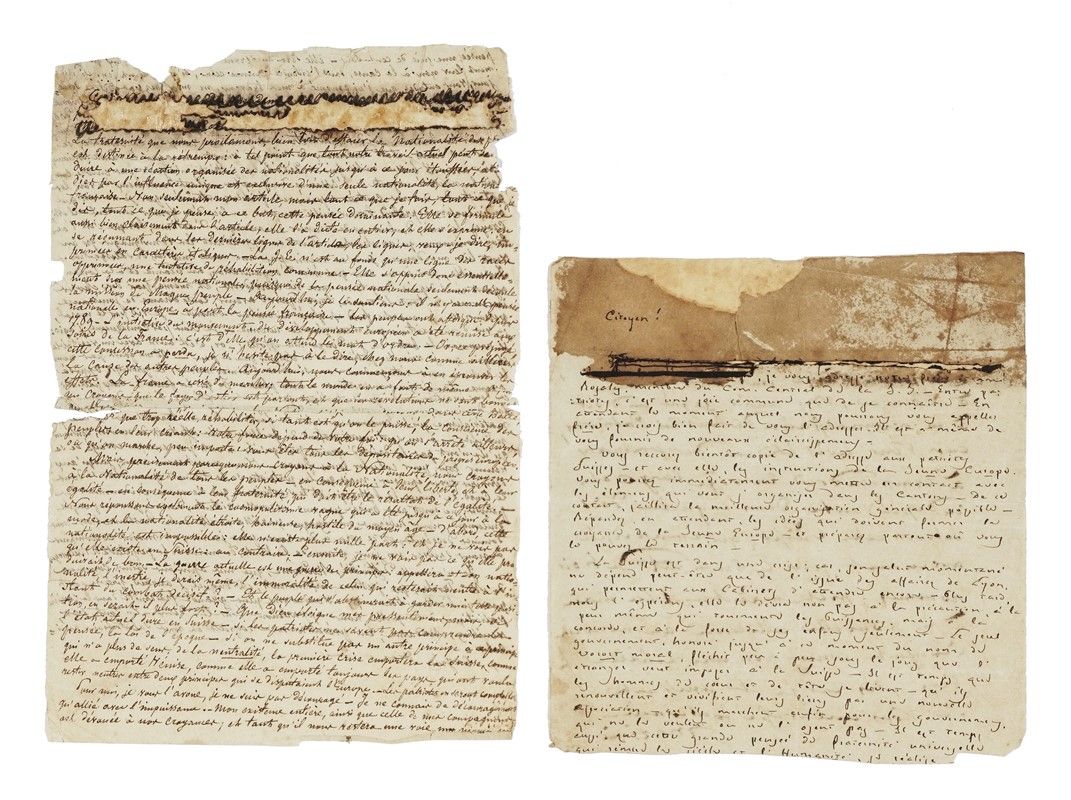 Manoscritto a inchiostro nero. Un bifolio, quattro pagine densamente scritte in francese. Minime lacune che non toccano il testo. Dimensioni bifolio 130x200 mm SI AGGIUNGONO: Id. Appunto cartaceo in francese. Mezza pagina, autografa di Mazzini al recto e di altra mano al verso. Nella parte superiore del documento, antica risarcitura cartacea parzialmente staccata e macchiata. Dimensioni 135x140 mm. Di altra mano, piccolo foglio manoscritto in francese (recto e verso), senza data ma della prima metà dell’800, che tratta delle idee francesi di liberté, egalité e fraternité ed esprime opinioni sulla situazione svizzera e sulla sua neutralità.