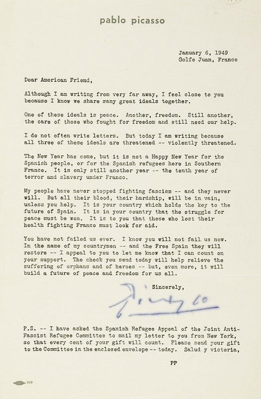 Dattiloscritto a inchiostro nero con firma (a timbro) a inchiostro blu. Su carta intestata pablo picasso. Testo in inglese. Dimensioni: 266x177 mm.
