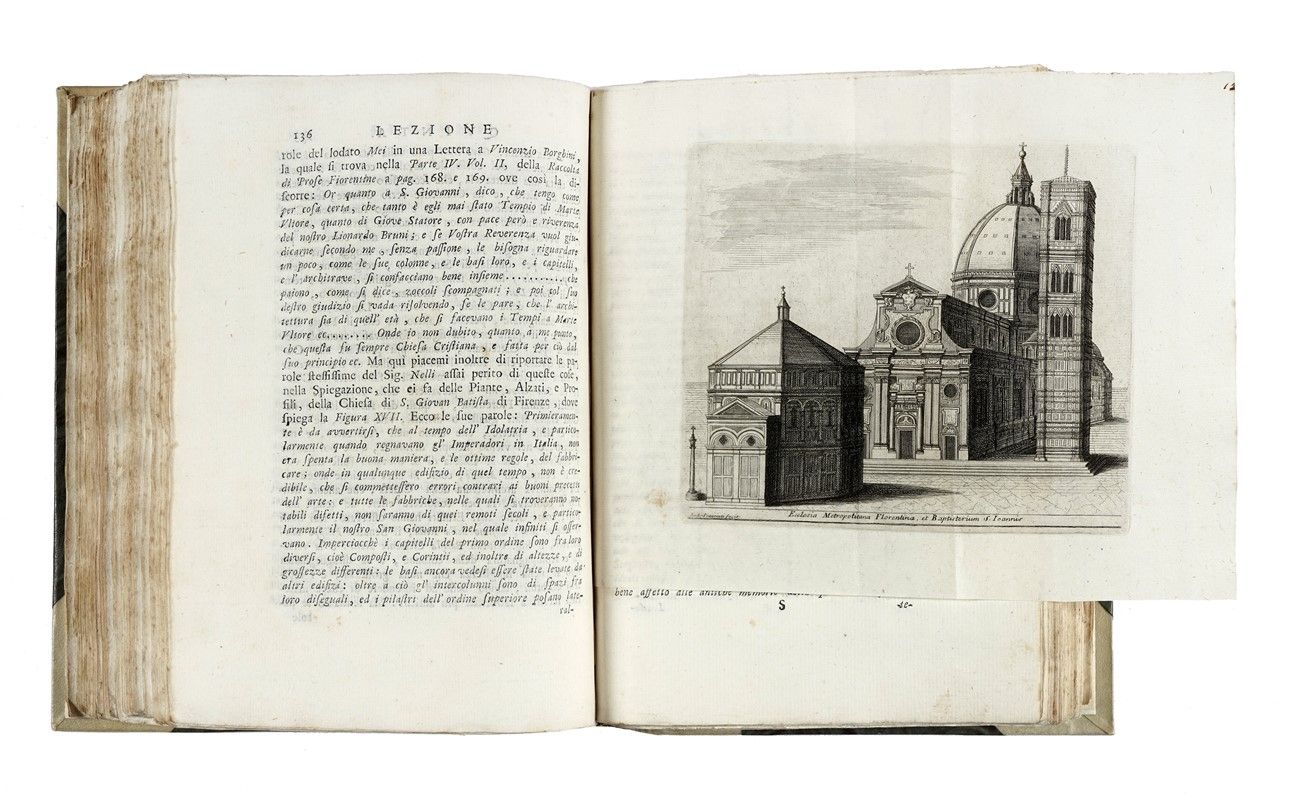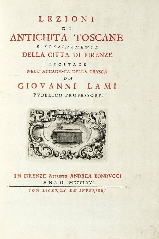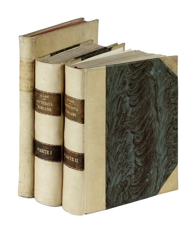 2 volumi in-8° (mm 236x172). Pagine CXCV, [1], 296; [2], 299-718, [2] bianche. Con 15 tavole fuori testo, compresi il ritratto dell'Autore e quello del Dedicatario Pietro Leopoldo Granduca di Toscana. Una tavola raffigura la pianta della città di Firenze com'era nel 1529. Frontespizio in rosso e nero con frullone della Crusca, 2 vedute di Firenze a mo' di testatine, capilettera e fregi xilografici. Uno strappo restaurato con nastro adesivo alle pagine LXXXIII-LXXXIV del primo volume, rare gore e fioriture sparse, altrimenti buon esemplare marginoso e parzialmente in barbe. Legatura moderna in mezza pergamena con punte e piatti marmorizzati; titoli in oro su doppio tassello al dorso e sguardie rinnovate. Ex-libris al contropiatto anteriore del primo volume. SI AGGIUNGE: Fontani Francesco, Elogio del dr. Giovanni Lami recitato nella reale Accademia fiorentina nell'adunanza del dì 27. di settembre 1787... Firenze: per Gaetano Cambiagi, 1789. In-4° (mm 272x200).