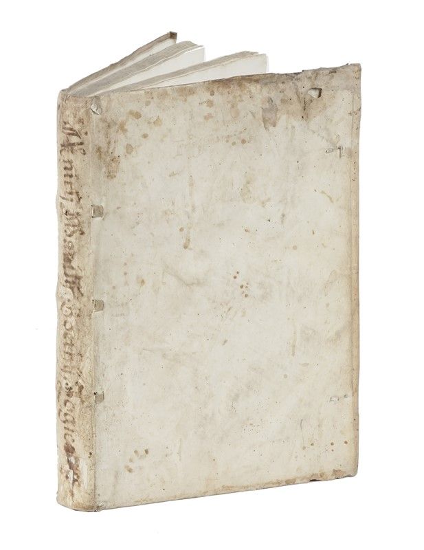 In folio (mm 307x206). Carte [2], 199, assente l'ultima bianca. Marca xilografica al frontespizio, capilettera e diagrammi incisi su legno. Primo bifolio quasi sciolto, pallida gora e sottile macchia d'inchiostro all'angolo superiore delle prime carte e poi al mergine esterno di quelle successive (ma è molto sottile), foro con minima perdita di testo a p. 70. per il resto copia molto genuina e croccante in pergamena flessibile coeva con titolo anticamente calligrafato al dorso (qualche difetto) e con frammenti di antica pergamena manoscritta. Nota di possesso al recto della carta di guardia anteriore 'Fr. Leonardus possidet Flore[ntiae] et amici et inimici'.