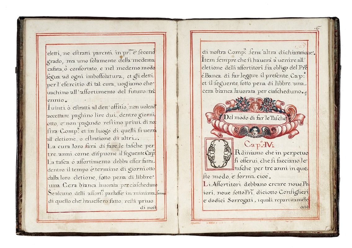 Manoscritto cartaceo a inchiostro nero, bruno, azzurro e rosso. Pagine 61 scritte, con specchi di scrittura incorniciati in rosso; 17 pagine bianche di cui una con specchio ovale arricchito da motivi policromi. Testo in italiano. Capitoli decorati in monocromia e capilettera ornati. Alle ultime pagine è presente l’approvazione in latino, datata 1710, con timbro a secco e firma autografa del cardinale Orazio Filippo Spada, seguita da altra non firmata del 1804. Fermagli con una chiusura mancante. Legatura in pelle con decorazioni in oro (con alcuni segni del tempo). Dimensioni: 170x235 mm.