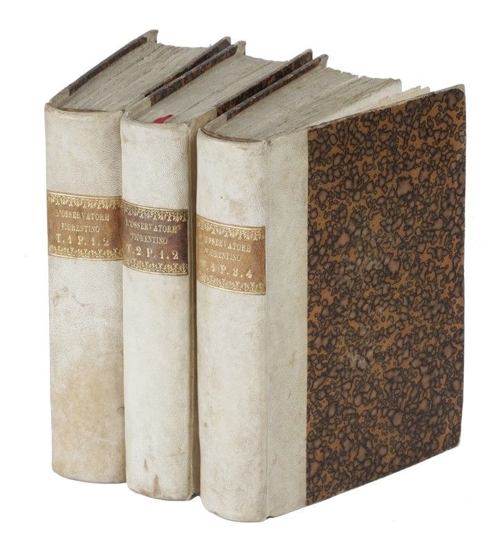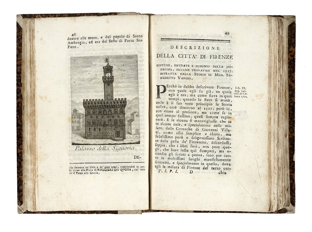 2 tomi in 3 volumi in-8° (mm 187x120). Pagine 192; 204; 206; 192; 187, [5]; 185, [1] con 1 mappa ripiegata della città e 9 incisioni, alcune ripiegate, fuori testo; numerose altre graziose vignette incise in rame nel testo, alcune anche da Callot. Mancante l'ultima carta del Tomo I Parte III (con mancanze reintegrate al margine interno del frontespizio). Uno strappetto restaurato con nastro adesivo alla tavola genealogica della casa dei Medici. Fioriture, lievi macchie e qualche strappetto marginale, altrimenti buona copia in barbe. Legatura coeva in mezza pergamena con piatti marmorizzati e titoli in oro su tassello al dorso; minime tracce d'uso, ma nel complesso ottimo stato di conservazione.