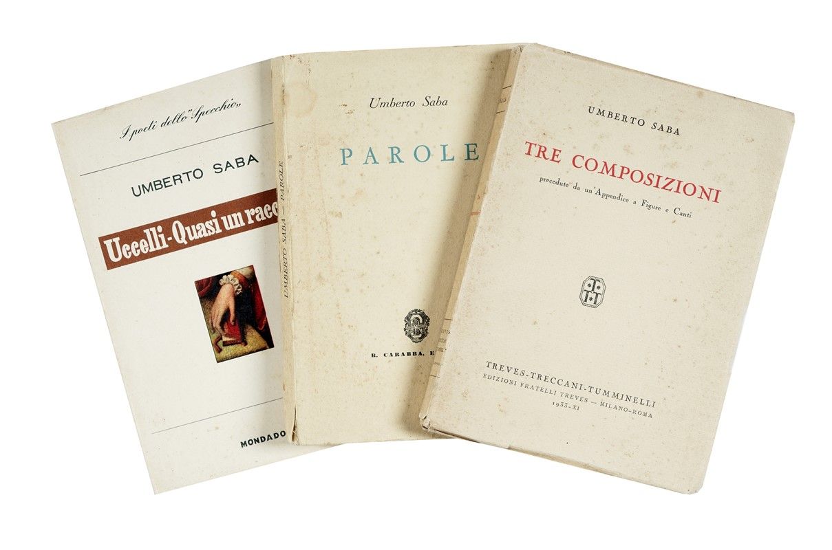 Compongono il lotto: 1) Saba Umberto, Parole. S.l.: Carabba, 1934; 2) Id., Tre composizioni. Milano-Roma: Treves, 1933; 3) Id., Uccelli e quasi un racconto. Verona: Mondadori, 1951.