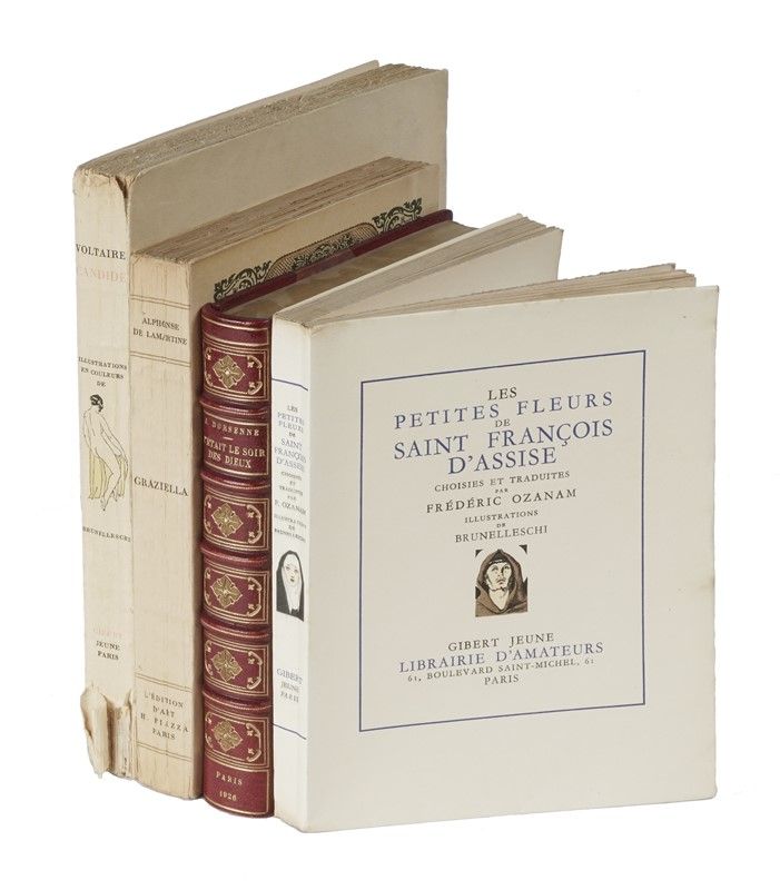 Compongono il lotto: 1) Les petites fleurs de Saint François d'Assise [...] illustrations de Brunelleschi. Paris: Gibert Jeune, 1942; 2) Voltaire François-Marie Arouet (de), Candide ou l'optimisme... Paris: Gibert Jeune,1933; 3) Lamartine Alphonse (de), Graziella. Illustrations de Brunelleschi. Paris: H. Piazza, 1931; 4) Dorsenne Jean, C'etait le soir des dieux. Illustrations de Brunelleschi... Paris: Mornay, 1926. Lievi difetti.