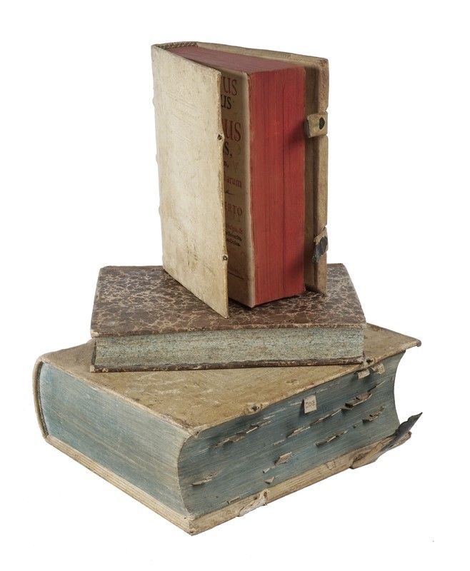 Compongono il lotto: 1) Freiesleben, Corpus Juris Civilis Academicum... Tomus I [- II] ... Coloniae Munatianae, Sumptibus Emanuelis Thurnisii, 1778, in-4° di oltre 3000 pagine con segnacoli vari, in pelle di scrofa coeva decorata a secco su assicelle con fermagli, tagli azzurri; 2) Verlohner, Tractatus methodicus de actionibus forensibus... Ingolstadii, Sunptibus JOannis Andreae de la Haye [...] Typis, Thomae Grass, 1716, in-4° piccolo, in pelle di scrofa coeva decorata a secco su assicelle con fermagli, tagli rossi; 3) Paoletti, Institutiones theorico-practicae criminales... Tomo I [- III]... Mediolani, Carolum Salvi Typèis Francisci Sonzogno, 1805-1806, terza parte in italiano, in-4° n mezza pelle coeva (sbucciature), tagli spruzzati d'azzurro. Non collazionati.
