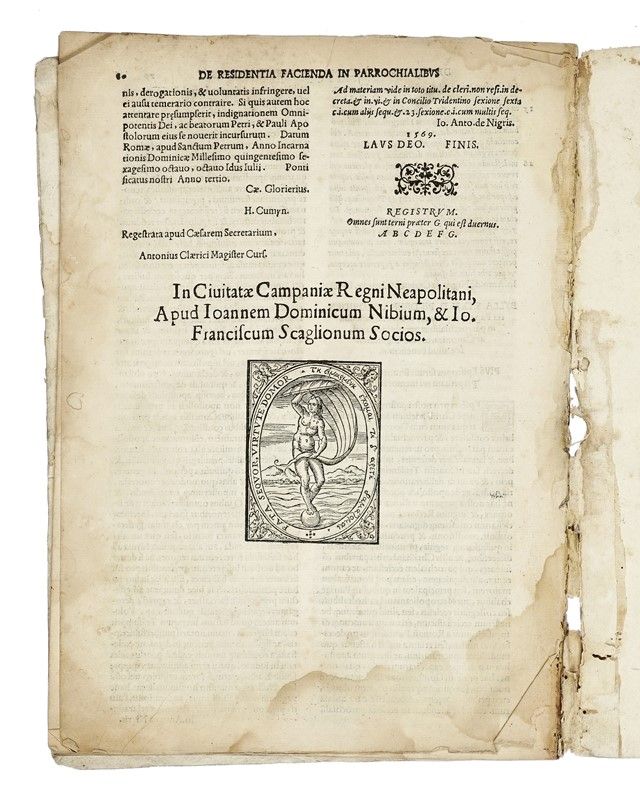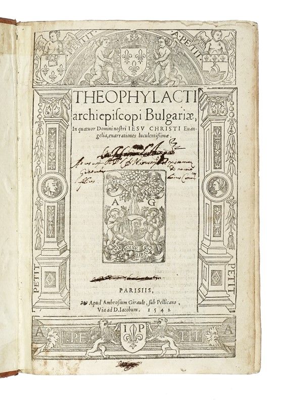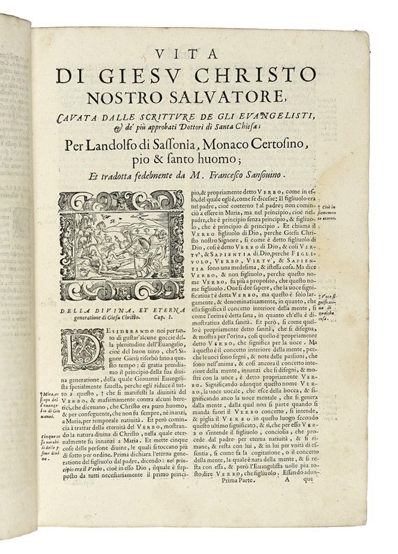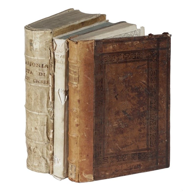 Compongono il lotto: Clemens VII (papa), Extrauagans constitutio contra clericos non incedentes in habitu, & tonsura vna cum mirifico apparatu… 1569. (In ciuitate Campaniae Regni Neapolitani apud Ioannem Dominicum Nibium, & Io. Franciscum Scaglionum socios, 1569), in-folio in carta marmorizzata settecentesca (sciupata al dorso), carte ingiallite, gora, scompleto dei fascicoli A-B4 in fine; Eusebius Caesariensis, Evangelicae demonstrationis libri decem. (Venetiis: in officina Aurelij Pincij Veneti, 1536 mense Martio), in folio in pergamena rigida settecentesca con tagli azzurri, non collazionato ma apparentemente completo e fresco; Theophylactus Achridensis, In quatuor Domini nostri Iesu Christi Euangelia, enarrationes luculentissimae. Parisiis: apud Ambrosium Girault, 1542, in-folio non collazionato ma apperentemente completo in legatura con piatti coevi e dorso rinnovato; Ludolph von Saxen, Vita di Giesu Christo nostro redentore [...] Nella quale con pia, et santa dottrina, si espongono con facilità gli Euangelij… In Vinegia: presso Altobello Salicato, 1589, in-folio in 2 parti in pergamena flessibile coeva con titolo anticamente manoscritto al dorso, non collazionato ma apparetemente completo, illustrato da vignette xilografiche in belle cornici.