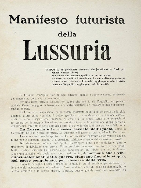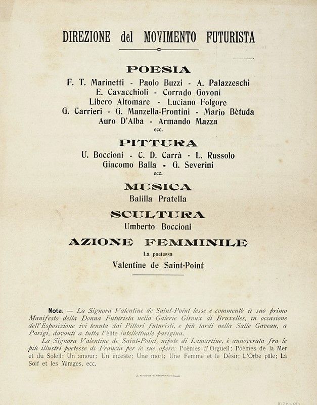 In-4° (mm 291x230). Carte [2]. Leggero segno centrale di precedente piegatura e leggere fioriture sparse, ma nel complesso ottima copia. SI AGGIUNGE: Id., Manifesto della Donna futurista. Risposta a F.T. Marinetti. Milano: Direzione del Movimento Futurista, 25 marzo 1912. In-4° (mm 290x230). Carte [2]. Segno centrale di precedente piegatura, altrimenti ottima conservazione.
