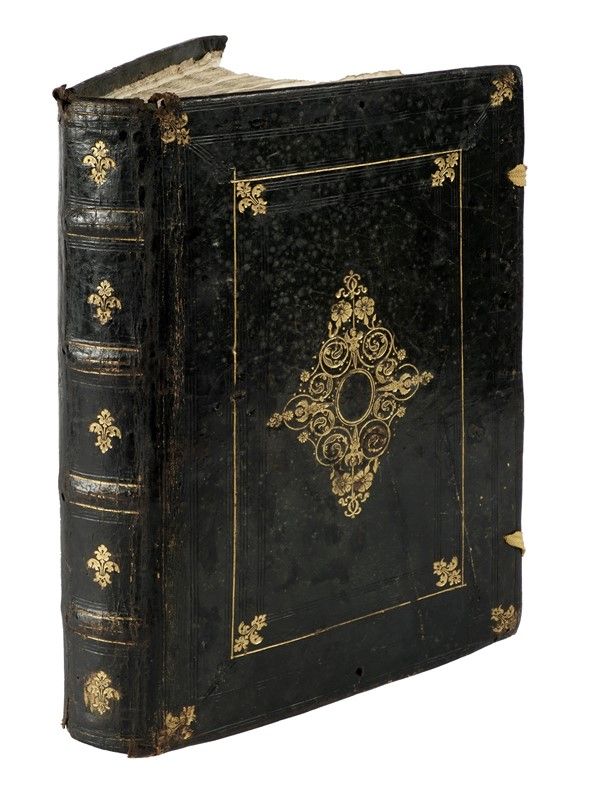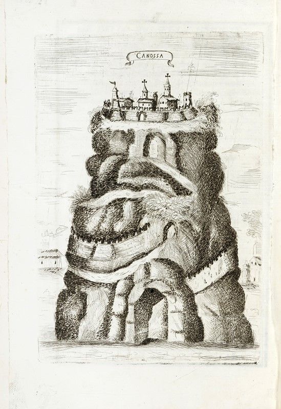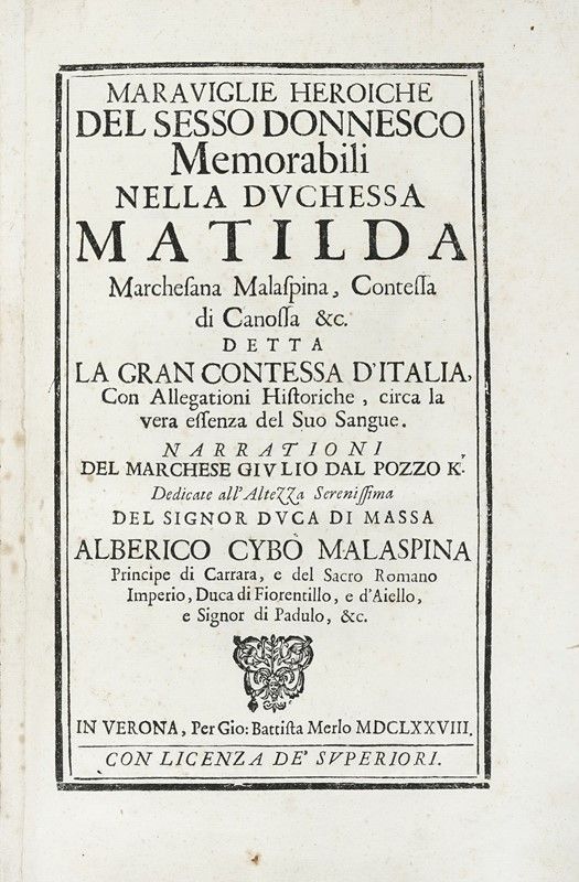 In-folio (mm 305x210). Pagine [8], 520 con 1 antiporta e 11 carte di tavole incise fuori testo a piena pagina o ripiegate. Cornice tipografica a incorniciare il frontespizio e tutte le carte di testo, fregio al frontespizio, capilettera, testatine e finalini xilografici. Esemplare con gore e fioriture diffuse e rinforzi al margine interno di molte pagine. Rimontata al contrario la tavola con l'albero genealogico, quasi completamente staccata, ma presente e ben conservata, la tavola di Attone dei Marchesi Malaspini, Primo conte di Canossa; completamente staccata e fortemente fiorita, invece, la tavola di Matilda Figliuola di Bonifatio Marchese Malaspina; uno strappo restaurabile alla seconda carta ripiegata. Legatura in piena pelle con medaglione dorato a motivi fitomorfi, entro cornici concentriche in oro e a secco, ai piatti; fregi in oro al dorso a 4 nervi, segni di precedenti fermagli al margine superiore e inferiore dei piatti, legacci in tela e sguardie marmorizzate. Abrasioni marginali e mancanze alle cuffie.