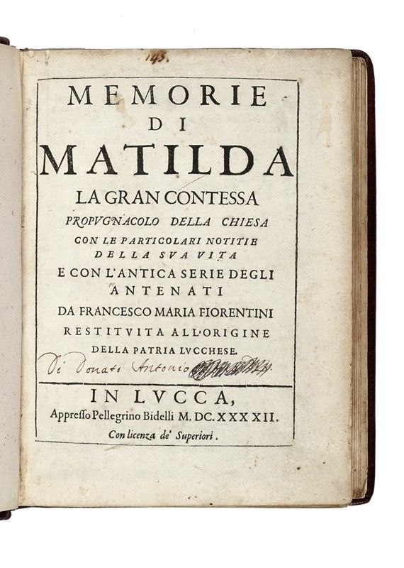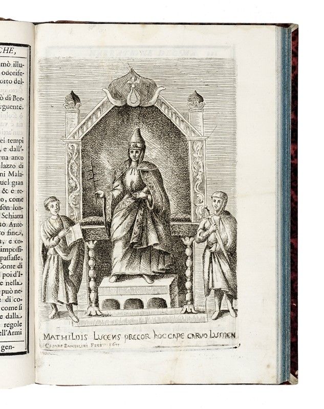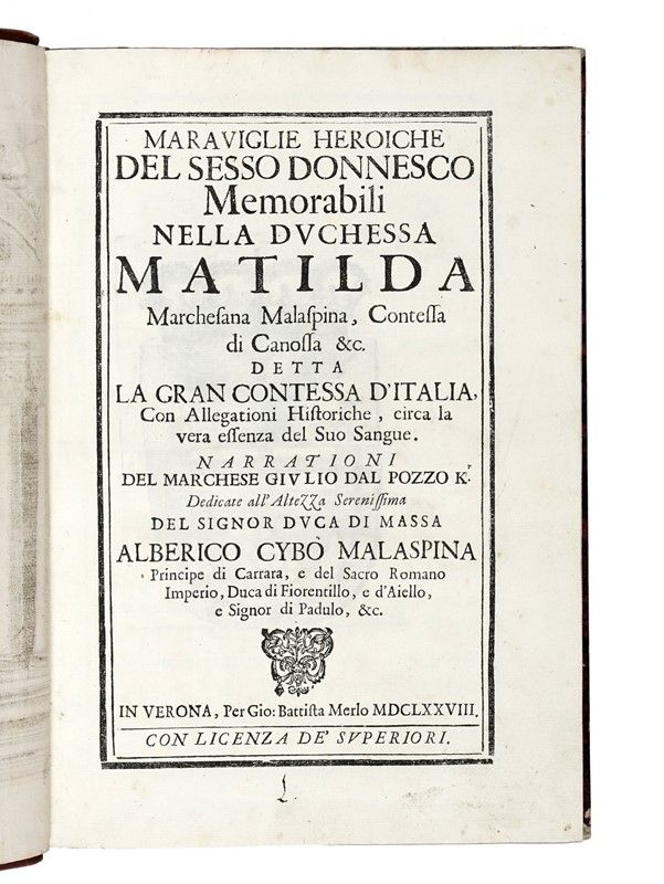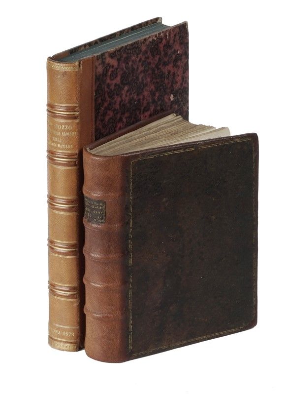 In-4° (mm 200x150). Pagine [8], 355, [1], 170, [18], con una bella antiporta calcografica fuori testo. OPAC segnata 4 tavole fuori testo, assenti in questo esemplare e in altri in commercio. Testo entro cornice tipografica. Copia rifilata, con lievi fioriture sparse. Legatura antica rimontata su base moderna (remboitage) con titoli impressi in oro su tassello al dorso a 5 nervi; sguardie rinnovate. Nota di possesso parzialmente cassata al frontespizio, ex-libris al contropiatto anteriore. SI AGGIUNGE: Dal Pozzo Giulio, Maraviglie heroiche del sesso donnesco memorabili nella Duchessa Matilda Marchesana Malspina, Contessa di Canossa... In Verona: Per Gio: Battista Merlo, 1678. Collazione disponibile su richiesta.
