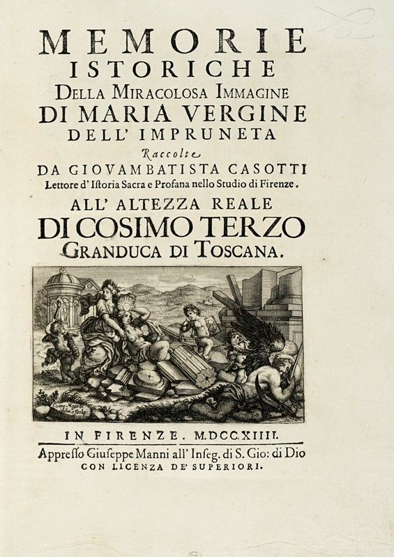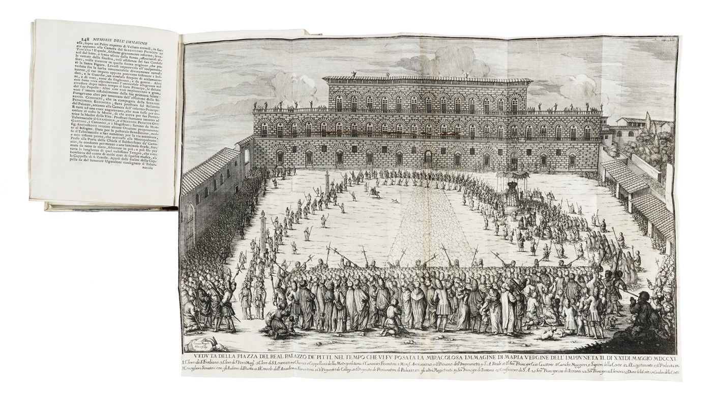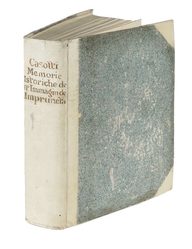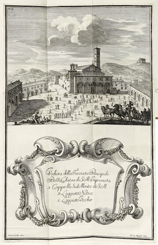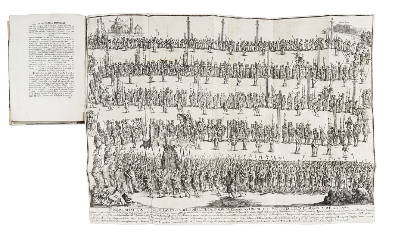 3 parti in 1 volume in-4° (mm 248x175). Pagine XV, [1], 318; [2], 231, [1]; 57, [3]. Con 10 grandi tavole calcografiche più volte ripiegate fuori testo incise in rame. Mancante l'antiporta figurata incisa in rame. Una gora alla prima tavola e uno strappetto restaurato senza perdite alla Veduta della facciata principale della Chiesa di S.M. Impruneta, alla tavola dell'Alzato del Chiostro piccolo e moderno..., a quella riguardante la Processione fatta in Firenze nella venuta della Miracolosa di Maria Vergine dell'Impruneta... e a quella con la Veduta della Piazza del Real Palazzo de' Pitti. Ampia mancanza reintegrata alla carta a1 della seconda parte e uno strappo senza perdite alla carta u1. Legatura successiva in mezza pergamena, con punte e piatti in carta decorata; titoli manoscritti al dorso. Abrasioni ai piatti e alle unghiature.