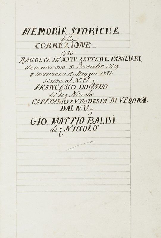 Manoscritto a inchiostro nero. Carte [16], 456, [4 bianche, sull’ultima è applicato 1 foglio sul quale sono scritti alcuni nomi relativi al Consiglio dei Dieci e altre annotazioni di carattere musicale]. All’interno del manoscritto sono inseriti alcuni testi a stampa: sulla carta 272 sono applicati due biglietti da visita [XVIII secolo] del Procurator di San Marco Giorgio Pisani [nel 1780 arrestato per corruzione elettorale], 2 incisioni ripiegate che ritraggono la piazza di S. Maria Formosa Eccell.mo Giorgio Pisano divi Marci ex merito procuratori ac uno praeclaro moecenati humaniss.mo [...], le pp. 303-306 contengono un opuscolo a stampa dal titolo Parte presa nel Serenissimo Maggior Consiglio addì 17 decembre 1780 (Venezia per li Figliuoli del qu. Z. Antonio Pinelli), altri opuscoli con medesimo titolo alle cc. 345-348, cc. 362-365, cc. 379-382, cc. 399-401, cc. 417-421, cc. 432-435, cc. 445-447. A c. 431 un ordine ripiegato datato 1671 (pubblicato sopra le scale di S. Marco e Rialto) relativo alla Parte presa nell’Eccelso Consiglio dei Dieci in materia de Avvocati e Sollecitadori [...]. Carte pesanti, in barbe al margine esterno e superiore, ben conservate. Legatura in mezza pergamena (la carta ai piatti presenta alcuni segni di usura). Alla costola è scritto: Correzione 1780. Dimensioni: 300x210 mm.