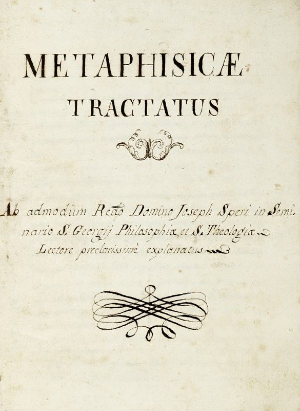 Manoscritto a inchiostro nero, in latino. Pagine 111 numerate, cui seguono 5 pagine bianche con antichi schizzi caricaturali e frasi di altra mano. Una corrosione da inchiostro non tocca il testo. Cartonatura dell’epoca, protetta da custodia telata moderna. Dimensioni: 140x200 mm.