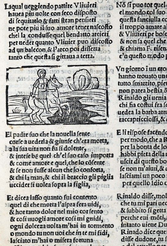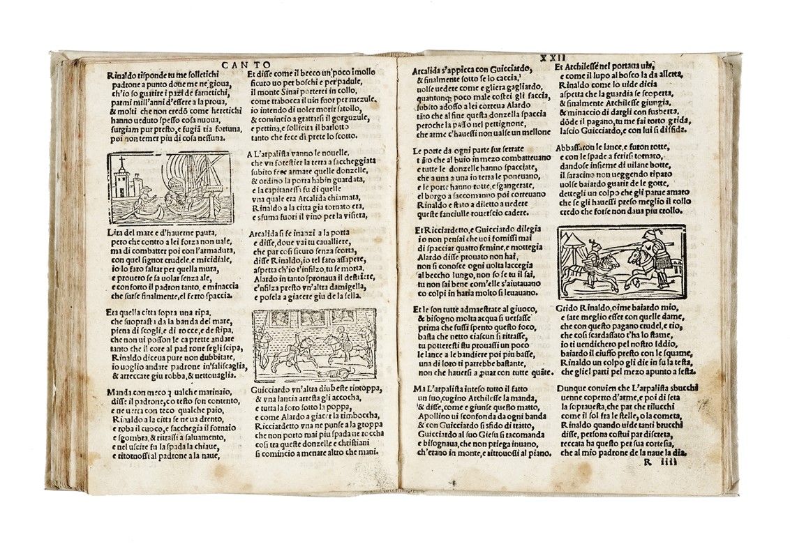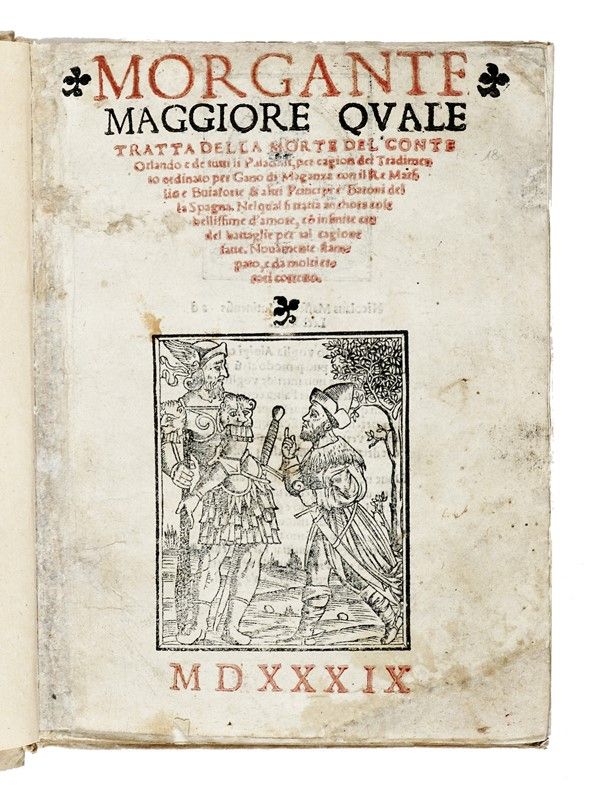 In-4° (mm 200x145). Carte [196]. Frontespizio in rosso e nero con una bella e grande vignetta xilografica raffigurante Morgante e Margutte, marca dello stampatore incisa sempre in legno in fine e numerose graziose xilografie nel testo. Frontespizio e carte successive con restauri in carta di riso che, in alcuni casi, velano leggermente il testo, strappetto al margine di B2, pallido alone ai primi fascicoli, carte occasionalmente brunite in modo pallido, margine superiore corto e rifilato verso la fine, e altre trascurabili tracce del tempo. Pergamena moderna in stile, con titoli calligrafati al dorso.