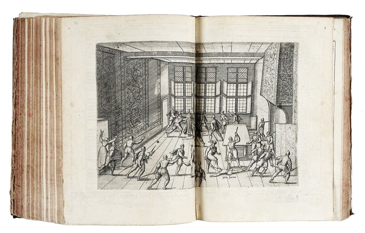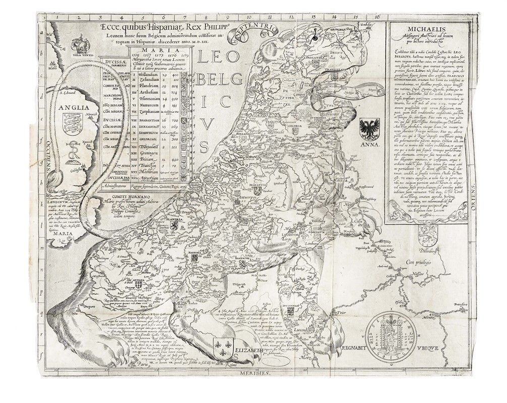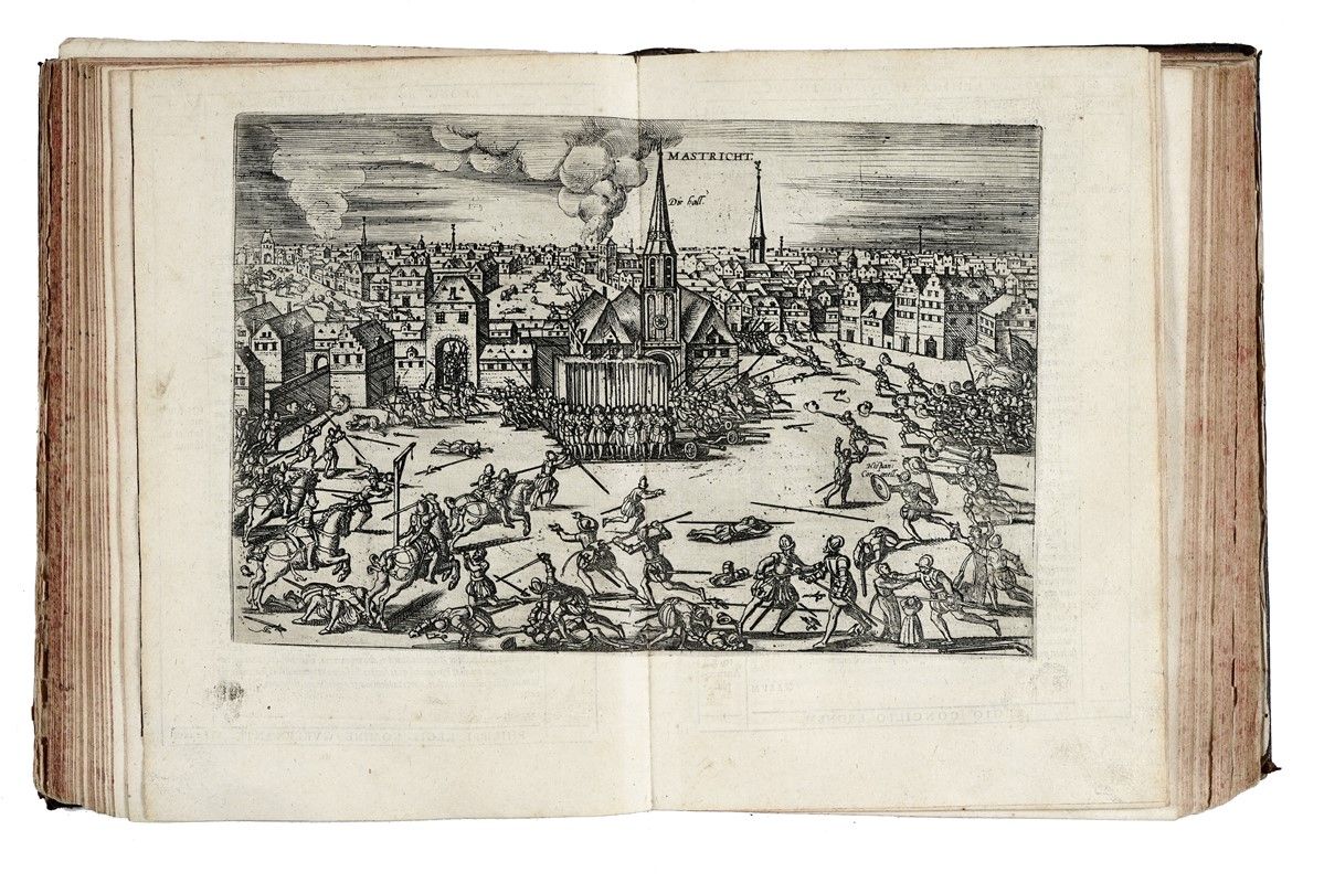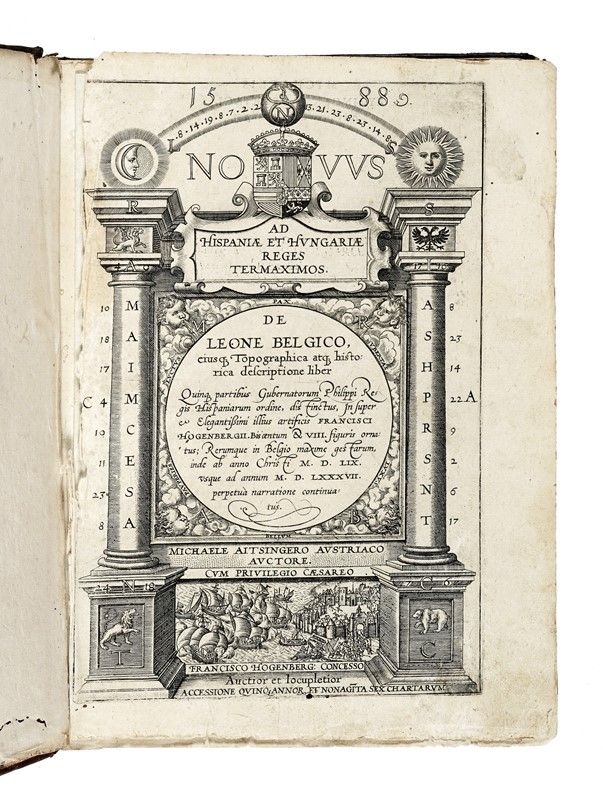 In-folio (mm 257x192). Carte: 6 [la 5 dopo la 6], [2], 9-430 [le carte 428 e 429 prima della 427]. Frontespizio calcografico, una grande mappa ripiegata del Belgio in forma di leone (staccata e con qualche strappo ma senza perdite), 208 tavole calcografiche a doppia pagina senza didascalie in calce (quelle tra le pp. 207/208 e 395/396 stampate sottosopra) e un Calendarium Belgicum inciso su rame in fine. Opera di difficile collazione in quanto priva di segnatura, ma collazionata e apparentemente completa (in base alla scheda SBN). Frontespizio sciolto e alcuni punti del volume un po' slegati, pallide bruniture occasionali, qualche forellino di tarlo. Assente il ritratto dell'autore al verso del frontespizio (come anche nella copia digitalizzata). Vitello marezzato coevo (sciupato), tagli spruzzati di rosso.