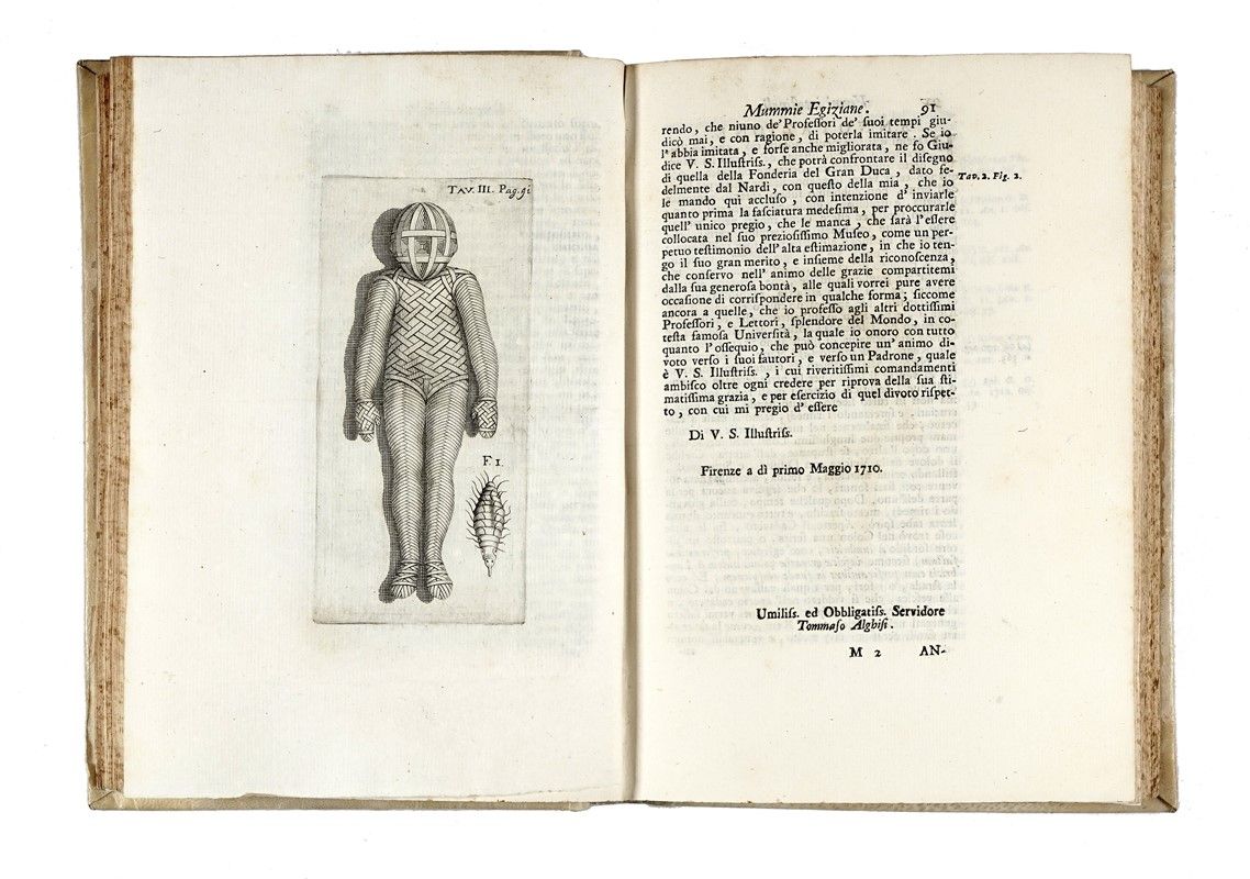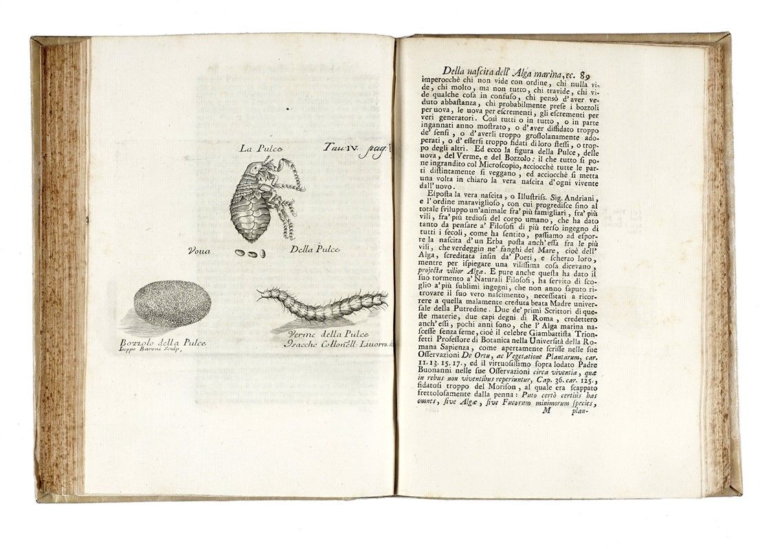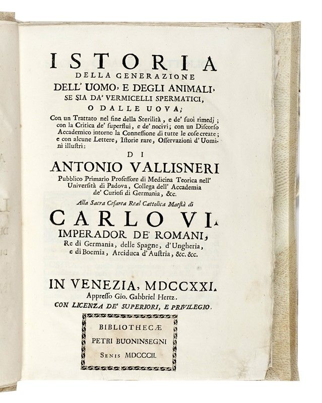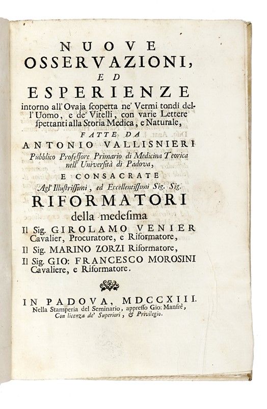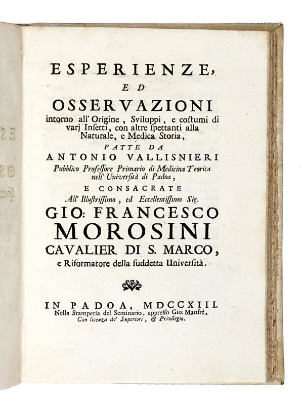 In-4° (mm 235x170). Pagine [16], 184 con 3 tavole calcografiche fuori testo, di cui 2 ripiegate e applicate nel margine esterno della carta di testo relativa. Capilettera incisi in legno. Ottima copia, con lievi fioriture marginali. LEGATA CON: Id., Esperienze, ed osservazioni intorno all'Origine, Sviluppi, e Costumi di vari Insetti, con altre spettanti alla Naturale, e Medica Storia... Padova: Nella stamperia del seminario, appresso Gio: Manfrè, 1713. In-4° (mm 235x170). Pagine [12], 232 con 12 tavole incise in rame fuori testo, di cui molte e ripiegate. Lievi fioriture ma buona copia. Legatura in piena pergamena coeva con titoli su tassello al dorso; forellini di tarlo al dorso e tracce d'uso. SI AGGIUNGE: Id., Istoria della generazione dell'uomo, e degli animali, se sia da' vermicelli spermatici o dalle uova [...] e con alcune lettere, istorie rare, osservazioni d'uomini illustri... In Venezia: appresso Gio. Gabbriel Hertz, 1721. SI AGGIUNGE: Id., Esperienze, ed osservazioni intorno all'Origine, Sviluppi, e Costumi di vari Insetti, con altre spettanti alla Naturale, e Medica Storia... Padova: Nella stamperia del seminario, appresso Gio: Manfrè, 1726.