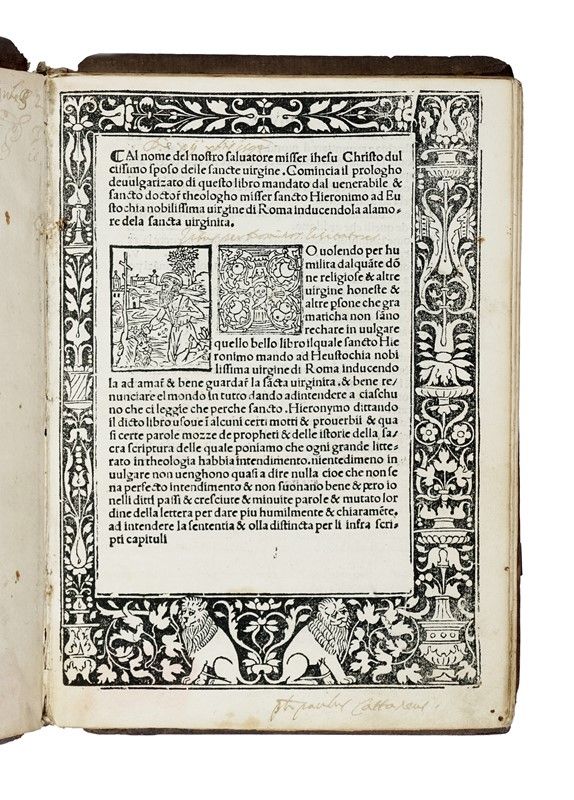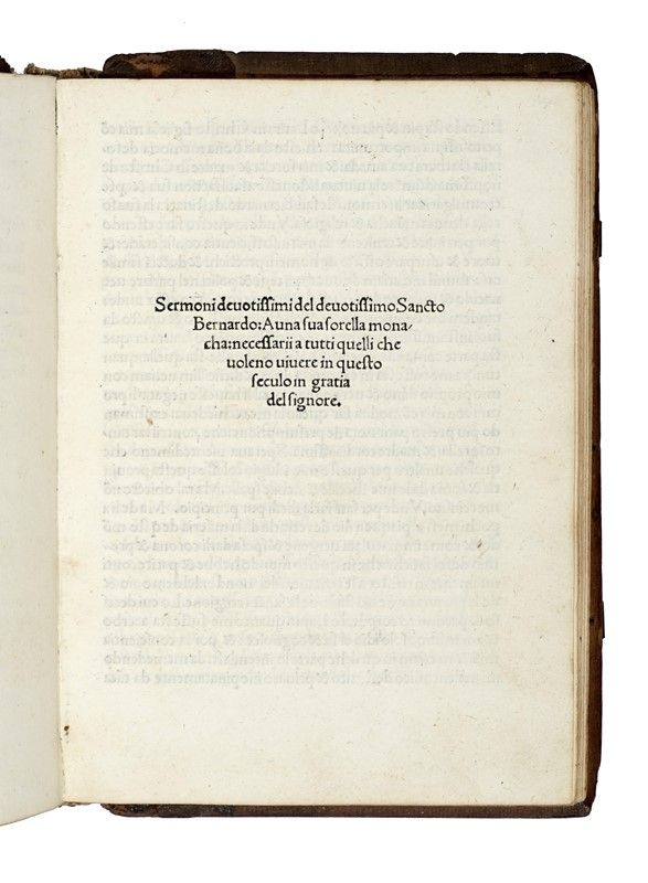 [LEGATO CON:] Hieronymus (santo), Regula [... ] data ad Eustochio: dove se insiegna el modo e la via: che tenere debiano le Sore nel suo vivere. (Al colophon:) Impressa in Bologna: per lo accuratissimo impressore Caligula de Bazalerii citadino bolognese, a di xxyiii de Martio 1498. [LEGATO CON:] Bernardus Claravallensis, Sermoni devotissimi [...] a una sua sorella monacha... (Al colophon:) Impressa in Venetia: per maestro Iacomo de Ragazone de Asola dicto bressano, 1497. A di xxiiii. de Marzo. 3 opere in un volume in-4° (mm 204x146). Carte: [16]; [50]; [4], lxxxxvi [i.e. cvi]. Prima opera con frontespizio entro cornice floreale xilografica su fondo nero, vignetta e iniziale; seconda opera con marca tipografica in fine. Piccolo alone sottile al margine inferiore del primo fascicolo della prima opera, che poi ricompare un po' più grande ad alcuni fascicoli del margine inferiore della terza, ma, nel complesso, buona copia genuina in legatura coeva in cuoio decorato a secco (mancanze) e assicelle di legno con tracce di fermagli. Una nota all'inizio del volume dice che esso fu acquistato presso la libreria Saba di Trieste.