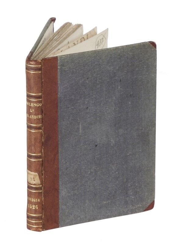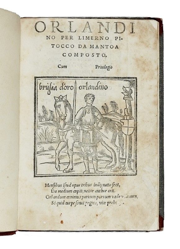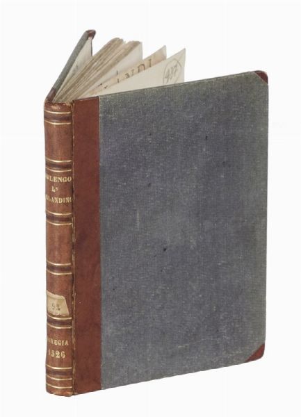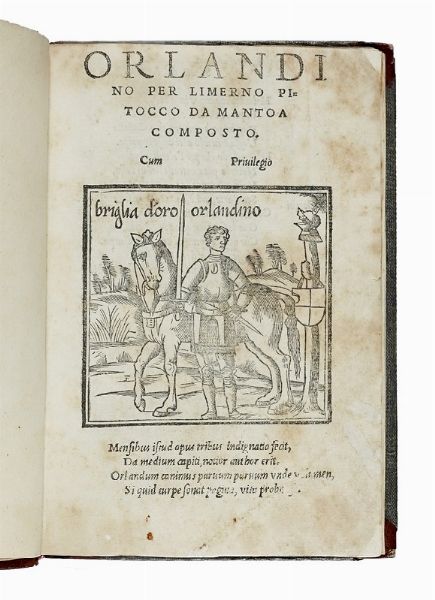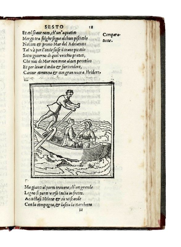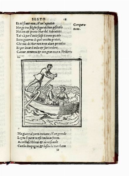 In-8° piccolo (mm 144x96). Carte: 92. Testo in corsivo illustrato da 10 vignette xilografiche, di cui una al frontespizio. Graziosa marca editoriale in fine. Frontespizio pallidamente fiorito e con gli angoli restaurati, come le carte successive, pallide fioriture occasionali, ultima carta abilmente controfondata e con poco più di 1 cm di margine bianco in basso asportato senza perdite. Nel complesso buona copia in mezzo vitellino posteriore con titoli in oro al dorso (cerniera anteriore con piccole fenditure esterne).