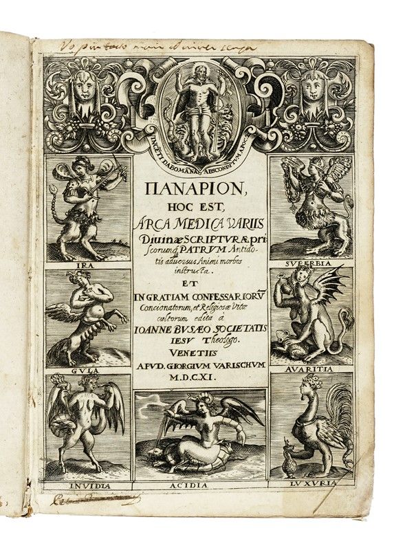 In-4° (mm 200x150). Carte [4], 298, [10]. Frontespizio xilografico entro bella cornice allegorica raffigurante i peccati capitali. Gore marginali a tutto il volume, macchie sparse, ampi fori di tarlo, che talvolta coinvolgono il testo, ai fascicoli B?, 2I?-2Q? e fioriture concentrate in alcuni fascicoli. Legatura in piena pergamena floscia coeva, con titoli manoscritti al dorso. Ampie mancante alle cerniere e alle cuffie, fori di tarlo al dorso; internamente staccato il piatto anteriore. Annotazioni al frontespizio, di cui una cassata. Esemplare da studio.
