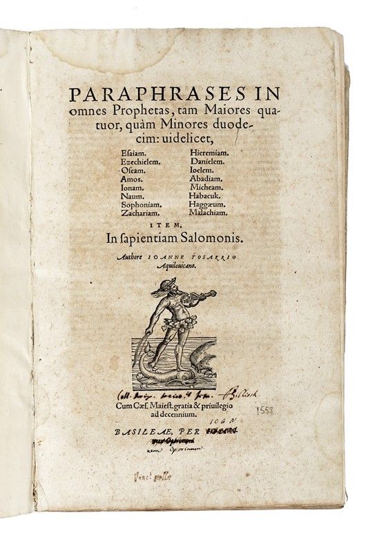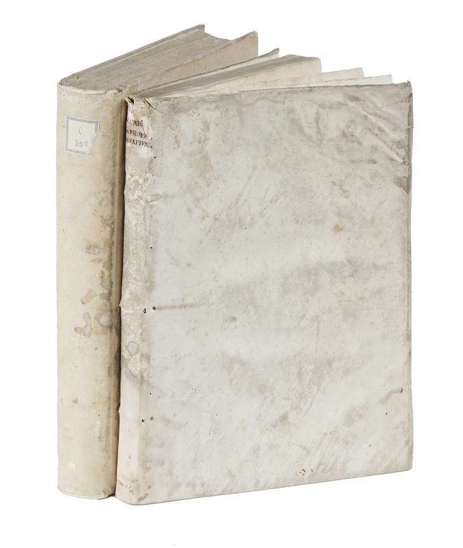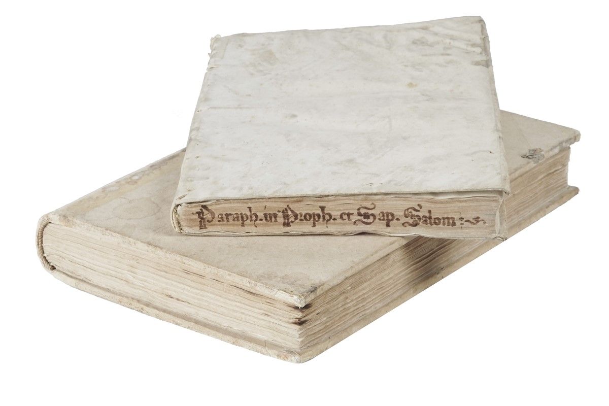 [RILEGATO CON:] Paraphrases in Duodecim Prophetas quos Minores vocant... Basileae, per Ioannem Oporinum, 1558. In-folio (mm 304x196) in due parti. Pallide arrossature occasionali, pallida gora al margine superiore delle prime carte, ma buona copia completa in pergamena flessibile coeva con titolo anticamente calligrafato al taglio inferiore. [SI AGGIUNGE:] Sant'Anselmo da Canterbury, Lucule[n]tissimæ in omnes sanctissimi Pauli Apostoli Epistolas enarrationes... Coloniae: ex officina Eucharij Ceruicorni, 1533. In-folio (mm 307x210), non collazionato ma apparentemente completo, con frontespizio entro cornice xilografica illustrata e un paio di grandi capilettera animati. Piccola bruciatura e gora al margine inferiore delle prime carte, pallide arrossature occasionali. In mezza pergamena posteriore con piatti in cartone molto spesso.