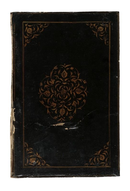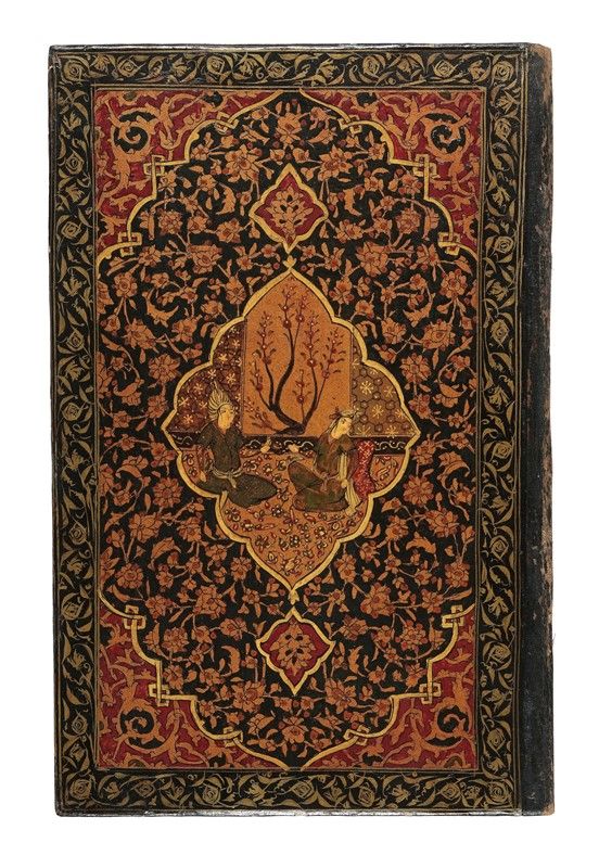 Splendidi piatti in cartone laccato (mm. 365 x 235 circa), appartenenti alla medesima legatura, proveniente dalla Persia di media età cagiara (tardo XIX secolo), con decorazioni arabescate in policromie di colori caldi su sfondo nero, centrate su di una struttura a simmetria assiale verticale composta da un medaglione centrale romboidale figurato a lobi e da due elementi minori posti specularmente sull’asse verticale. La mandorla centrale del piatto anteriore è abitata da una coppia di amanti in abito tradizionale, ritratti affrontati in conversazione galante all’interno di una stanza finestrata sul cui fondo si intravedono i rami di un albero dai rami carichi di pomi. Sulla mandorla centrale del piatto posteriore la medesima coppia è colta in un close-up, rappresentata ravvicinata e sul medesimo sfondo, ma in abiti diversi. Le posizioni rispettive risultano invertite, la donna con il capo inclinato sull’amante in un gesto di affettuosa intimità. Ciascuno dei due medaglioni con scene romantiche è circondato da un intrigo sapiente di arabeschi bruni e oro in campo nero, a loro volta messi in risalto dagli spazî angolari e da una bordura interna in nero decorata con elementi disegnativi a racemi e fogliame dorati. L’interno dei due piatti si presenta decorato da una composizione di boccioli e fiori in monocromia dorata con quattro decori identici tra loro che abbelliscono gli angoli interni, il tutto racchiuso da una doppia bordura dorata.