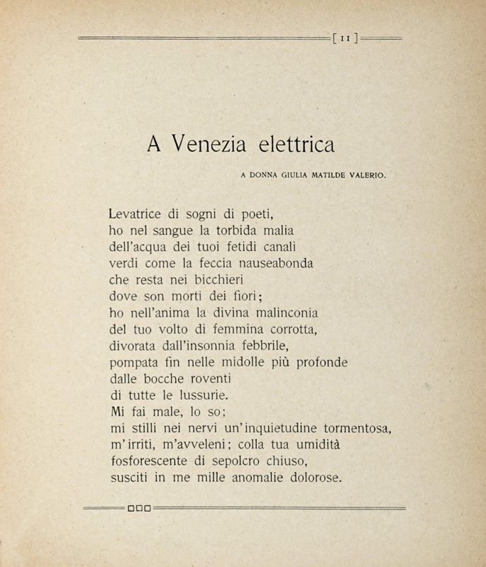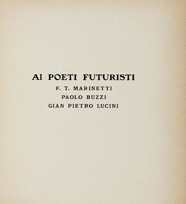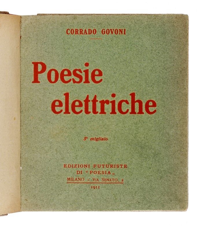 In-16° (mm 187x170). Minime tracce d'uso, ma nel complesso buona copia. Legatura successiva in piena tela con titoli in oro su tassello al dorso; conservati all'interno i piatti della brossura originale verde con titoli in rosso. Formato quadrotto "a mattonella", tipico dei volumi delle Edizioni futuriste di Poesia. SI AGGIUNGE: Id., Poesie scelte. Ferrara: Taddei, 1918. Legatura moderna in piena tela, con titoli in oro su tassello al dorso.