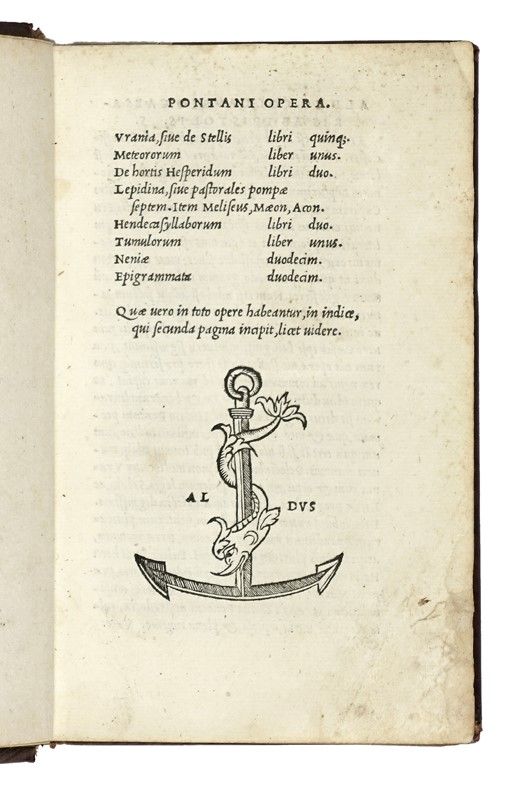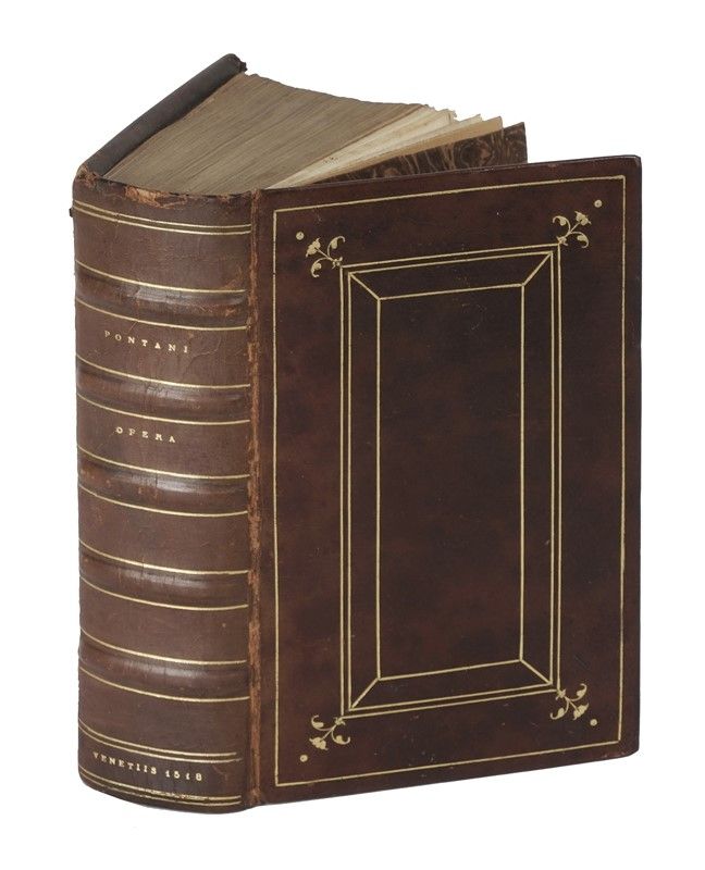 [LEGATO CON:] Pontano Giovanni Gioviano, Amorum libri II. De amore coniugali III... (Al colophon:) Venetiis: in aedibus Aldi, et Andreae soceri, mense Februario 1518. Due opere in un volume in-8° (mm 160x100). Carte: [8], 247, [1]; 170, [2]. Ancora aldina al frontespizio e in fine a ogni opera, testo in corsivo. Minimo restauro al primo frontespizio, occasionali pallide gore marginali (un po' più grandi ai fascicoli n-o della prima opera), ma nel complesso buona copia in elegante vitellino moderno in stile, con i tagli dorati (minimo difetto alla cuffia).