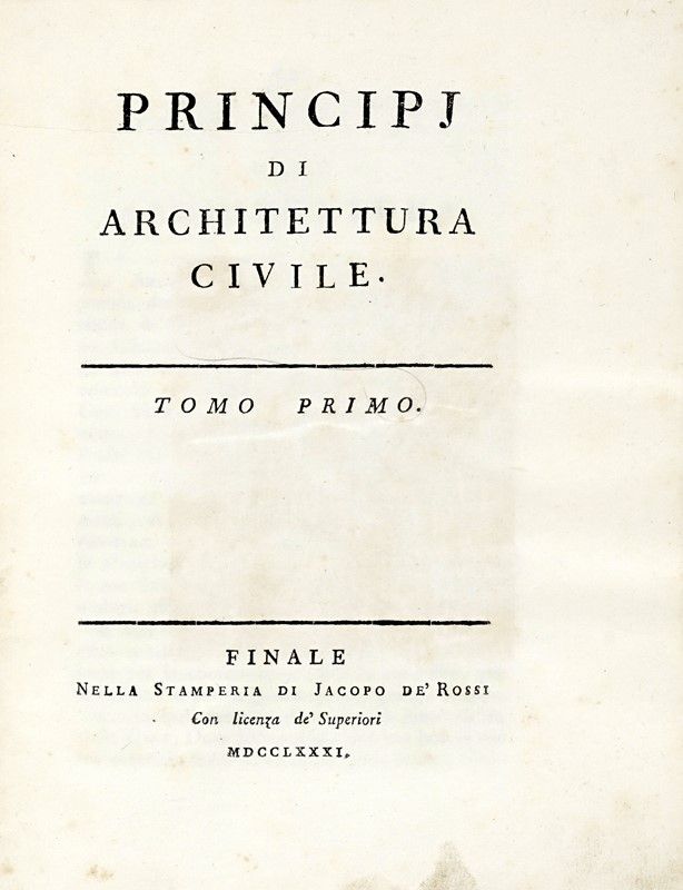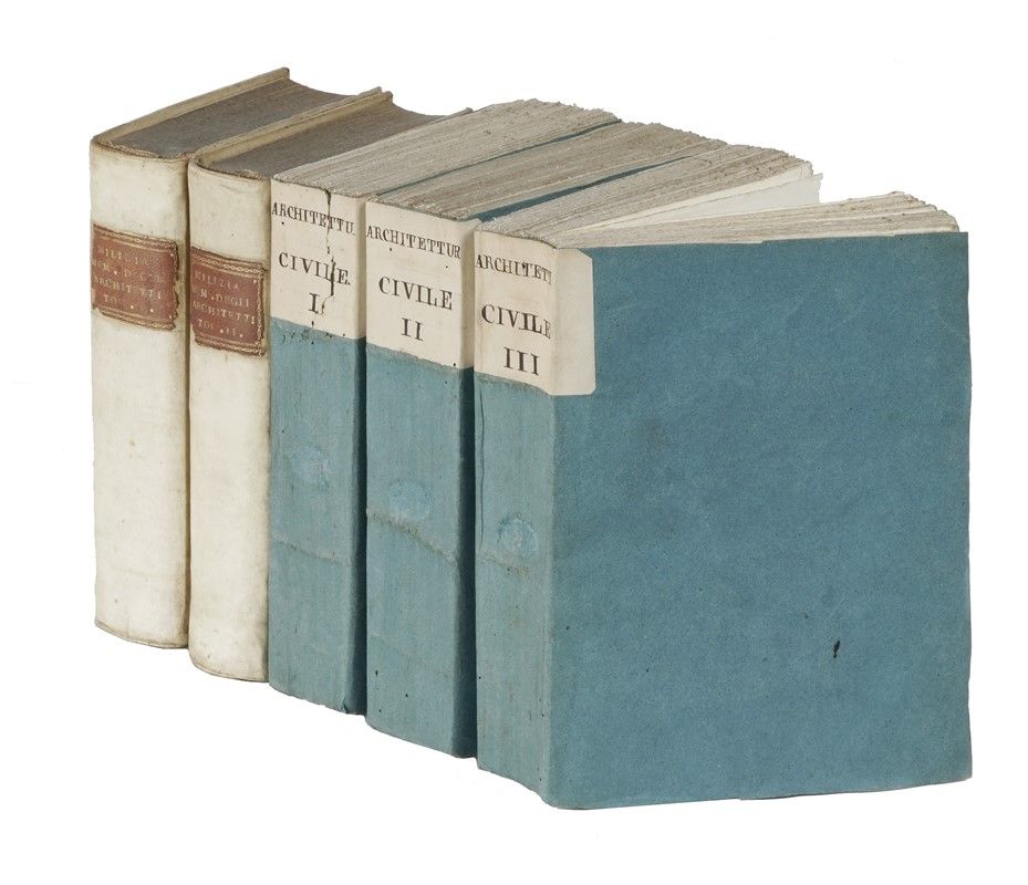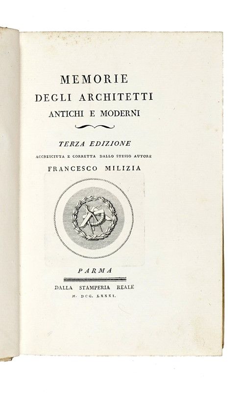 3 volumi in-4° (mm 223x165). Copia marginosa, ben conservata nelle sue barbe, con 1 tabella ripiegata e 8 tavole fuori testo incise in rame, rilegate alla fine del terzo volume. Legatura in cartonato, con titoli manoscritti su tassello cartaceo al dorso. Ex-libris applicato al verso del frontespizio di ciascun volume. Collazione disponibile su richiesta. SI AGGIUNGE: Id., Memorie degli architetti antichi e moderni. Terza edizione accresciuta e corretta dallo stesso autore... Tomo primo (-secondo). Parma: dalla Stamperia reale, 1781. 2 volumi in-8° (mm 210x140). Ottio stato di conservazione. Legatura coeva in piena pergamena con titoli in oro su tassello al dorso.