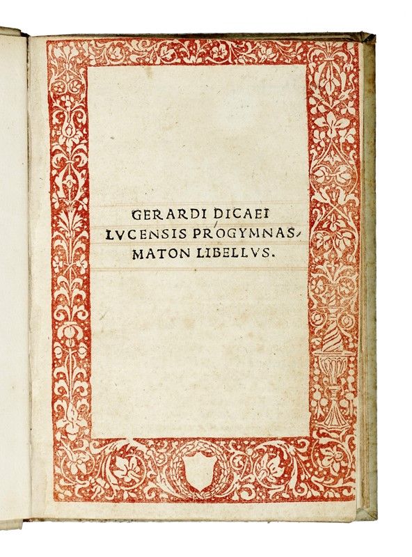 In-4° piccolo (mm 200x138). Carte: [128 (di 136), assenti i 2 fascicoli finali r-s4]. Frontespizio entro bella cornice xilografica floreale stampata in rosso (leggerissimamente rifilata), testo interamente rubricato. Qualche occasionale alone pallido e altre trascurabili tracce del tempo. Piena pergamena rigida posteriore con tassello nero al dorso.