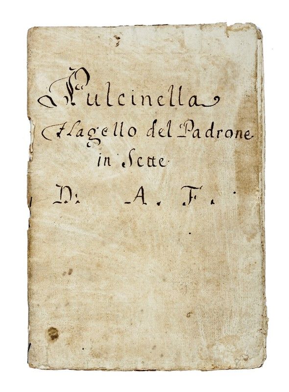 Manoscritto a inchiostro bruno. 10 carte. Testo in italiano. Il canovaccio è preceduto dalla lista degli Interlocutori e seguito da Robbe necessarie (oggetti di scena) scritti da altra mano ed evidentemente aggiunti successivamente al canovaccio (diversa è anche la qualità della carta), dal momento che i personaggi presentati tra gli interlocutori non corrispondono a quelli che si leggono nel canovaccio. Sulla brossura è scritto: Pulcinella / flagello del padrone / in Sette / D: A[ndreini]. F[rancesco]. Alcune bruniture della carta, ma testo comunque abbastanza leggibile. Brossura dell’epoca rinforzata con un foglio sul quale si intravede un rigo musicale. Dimensioni: 195x135 mm.